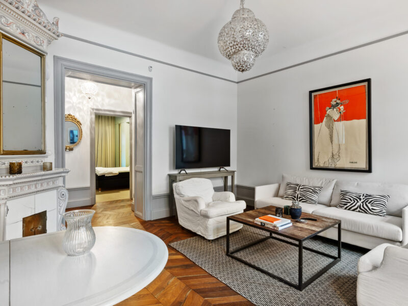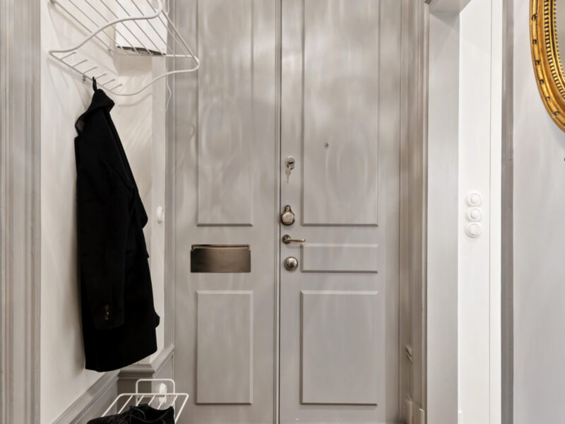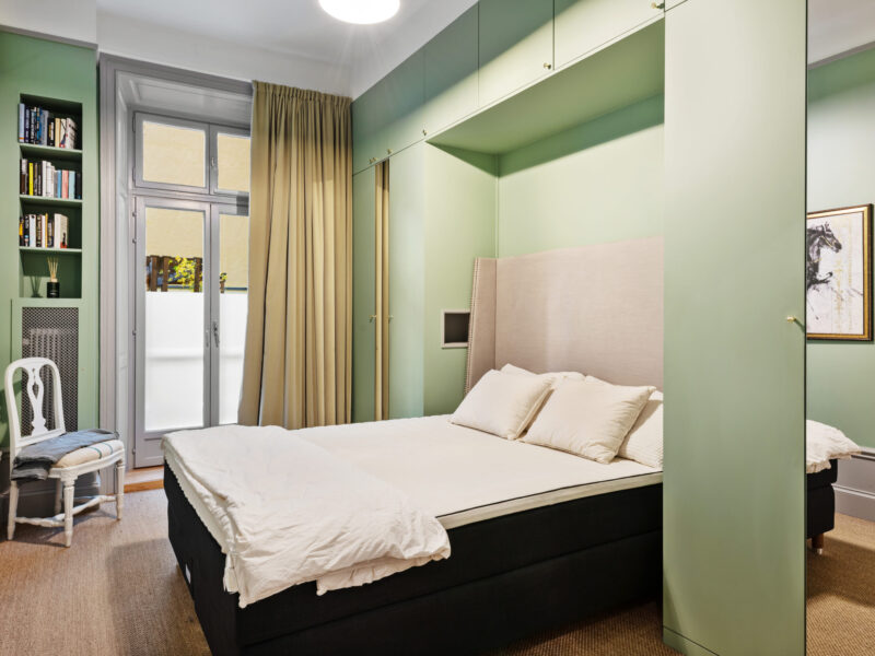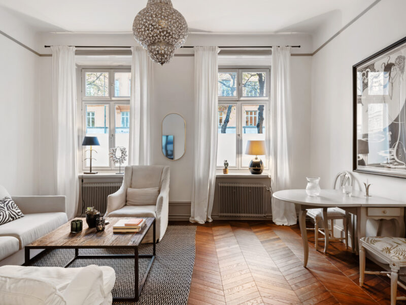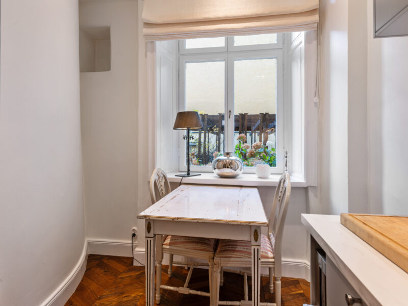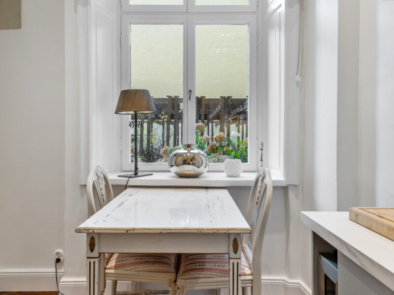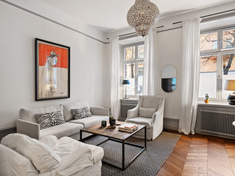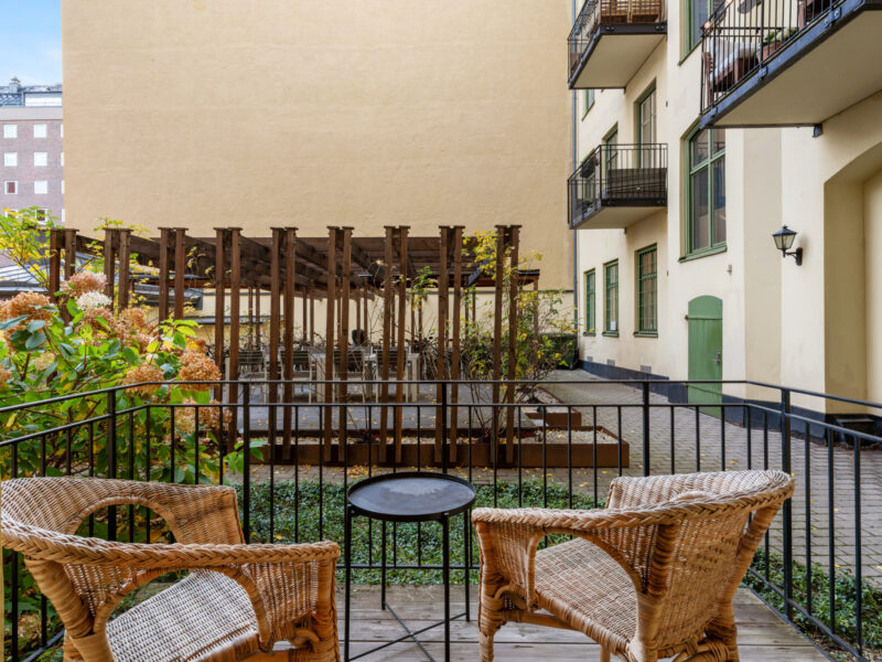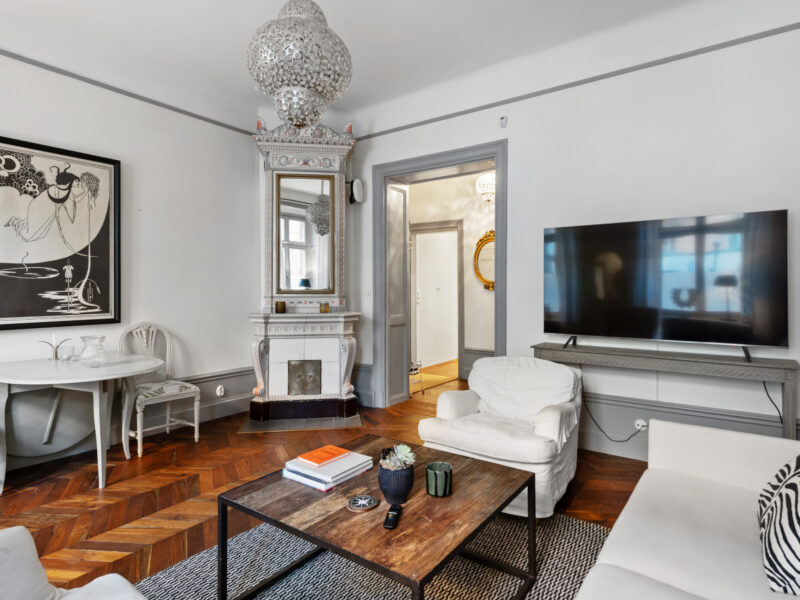Bostaden har generös takhöjd, fiskbensparkett, spegeldörrar och en vacker kakelugn som skapar rätt känsla redan i vardagsrummet där det finns gott om plats för både soffgrupp och matplats samt en naturlig tv‑vägg. Det rofyllda sovrummet vetter mot gården och är inrett med platsbyggd förvaring runt sängen, spegelpartier som ger rymd och utgång till en trivsam liten uteplats/fransk balkong mot föreningens innergård där två rottingfåtöljer ryms för morgonkaffet. Köket är ett effektivt arbetskök i sober grå ton med lång bänkyta, induktionshäll, inbyggnadsugn, bra förvaring bakom släta luckor och ett tidlöst vitt kakel i tegelmönster, allt samlat längs ena väggen för optimalt arbetsflöde. Badrummet är helkaklat i ljusa naturtoner med glasad duschhörna, takdusch, kommod med förvaring och handdukstork. Den välkomnande hallen erbjuder bra avhängning och skoställ samt vackra snickerier i grått som binder ihop bostadens färgsättning. Lägenheten hyrs ut möblerad och passar utmärkt för singel eller par som vill bo representativt nära city, restauranger och kommunikationer samtidigt som man har lugnet mot gård. Välkommen att höra av dig vid intresse eller frågor.