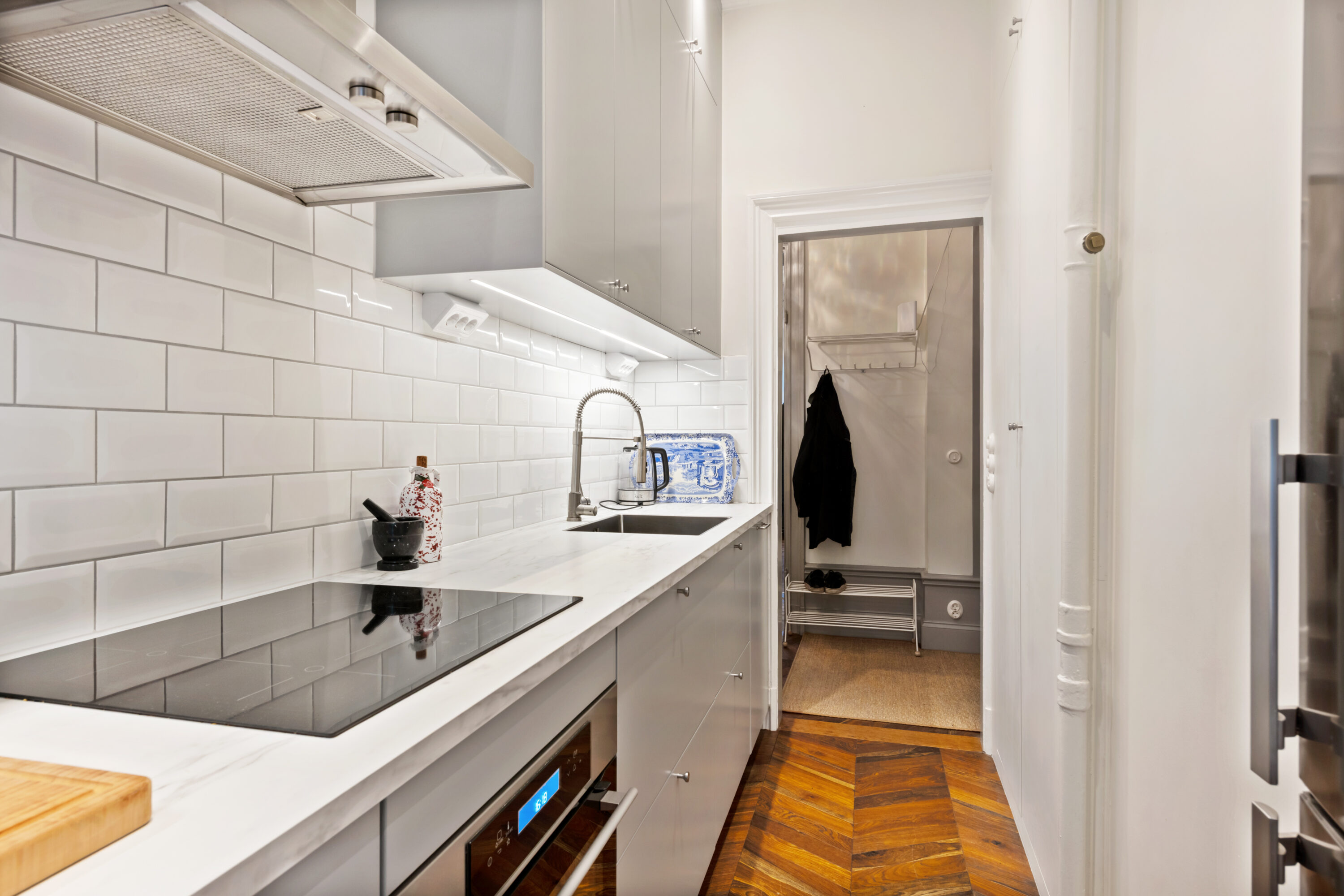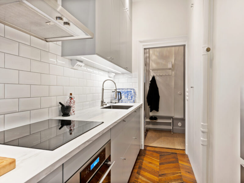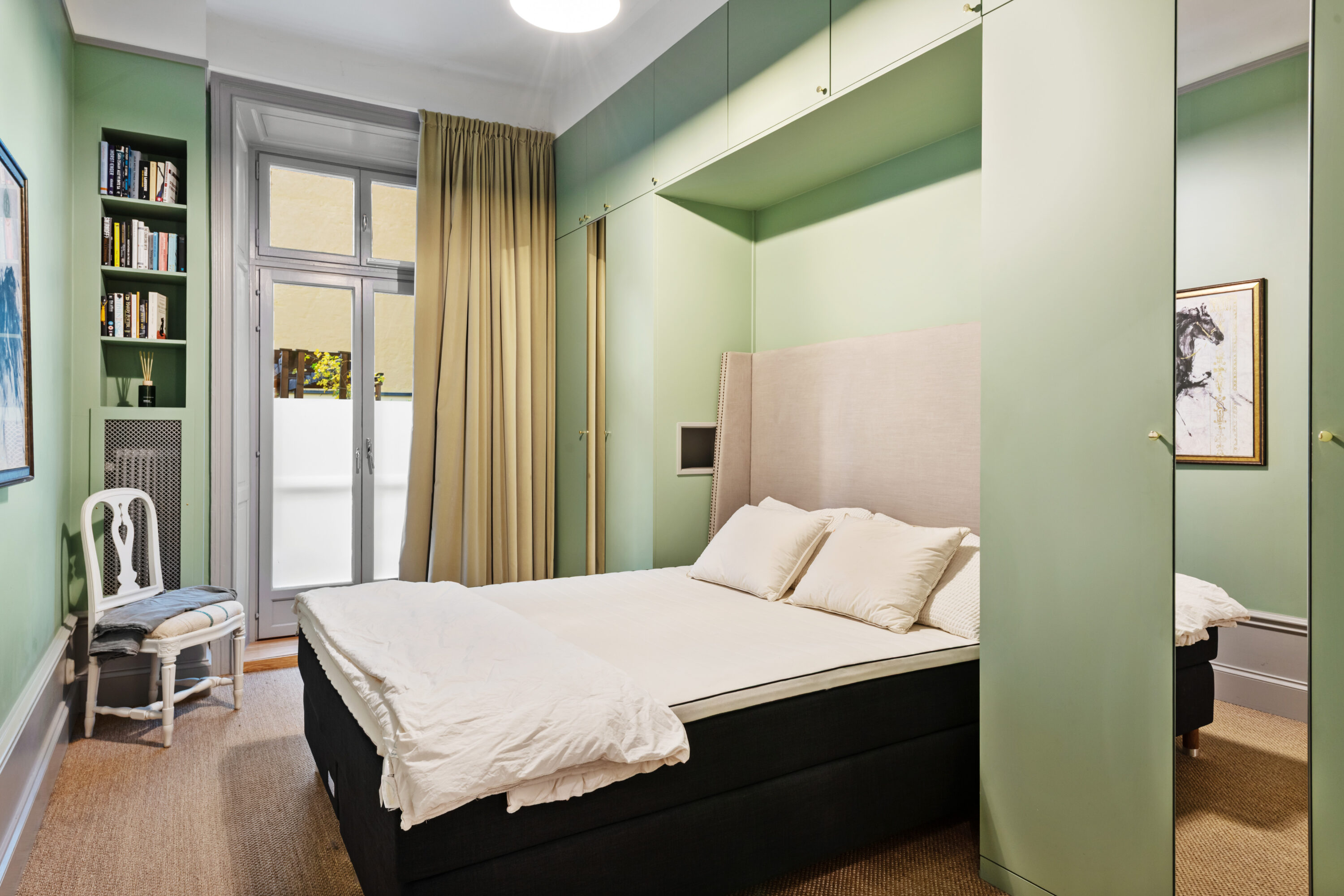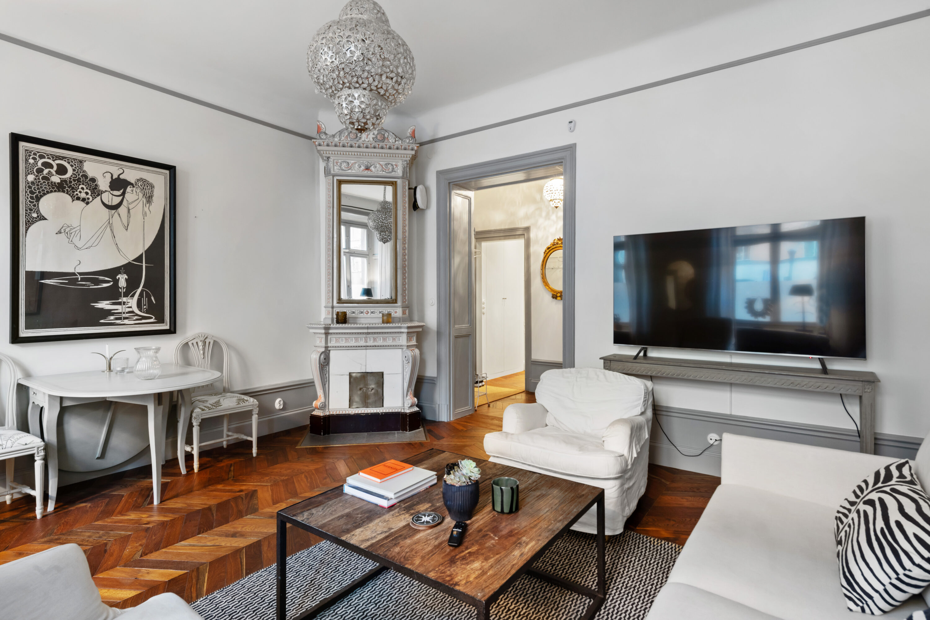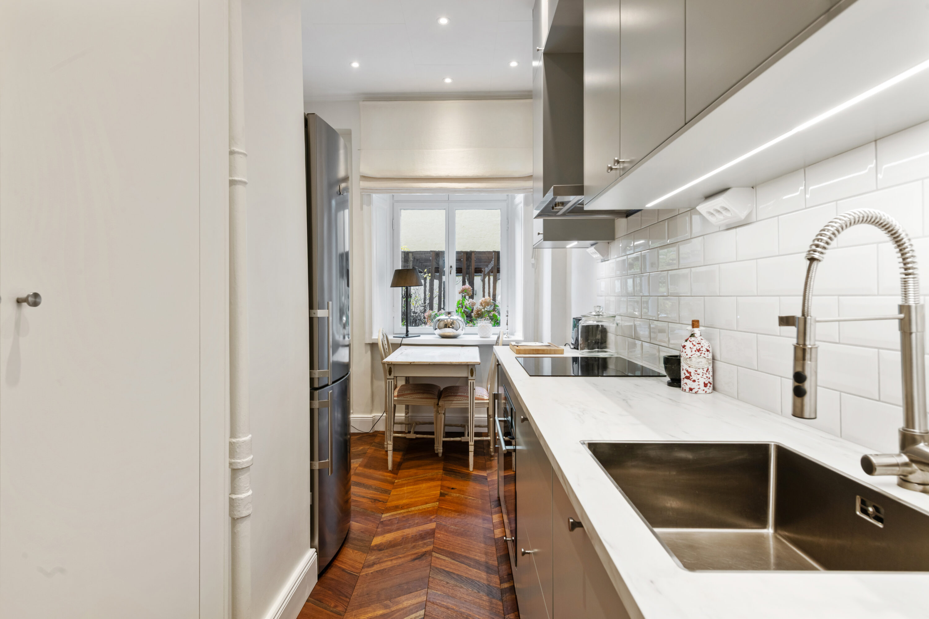 Bostaden har generös takhöjd, fiskbensparkett, spegeldörrar och en vacker kakelugn som skapar rätt känsla redan i vardagsrummet där det finns gott om plats för både soffgrupp och matplats samt en naturlig tv‑vägg. Det rofyllda sovrummet vetter mot gården och är inrett med platsbyggd förvaring runt sängen, spegelpartier som ger rymd och utgång till en trivsam liten uteplats/fransk balkong mot föreningens innergård där två rottingfåtöljer ryms för morgonkaffet. Köket är ett effektivt arbetskök i sober grå ton med lång bänkyta, induktionshäll, inbyggnadsugn, bra förvaring bakom släta luckor och ett tidlöst vitt kakel i tegelmönster, allt samlat längs ena väggen för optimalt arbetsflöde. Badrummet är helkaklat i ljusa naturtoner med glasad duschhörna, takdusch, kommod med förvaring och handdukstork. Den välkomnande hallen erbjuder bra avhängning och skoställ samt vackra snickerier i grått som binder ihop bostadens färgsättning. Lägenheten hyrs ut möblerad och passar utmärkt för singel eller par som vill bo representativt nära city, restauranger och kommunikationer samtidigt som man har lugnet mot gård. Välkommen att höra av dig vid intresse eller frågor.