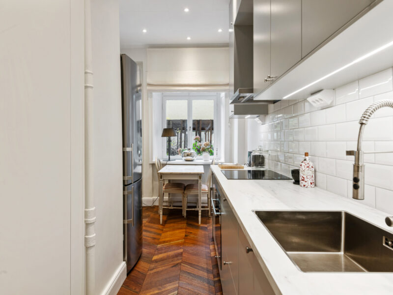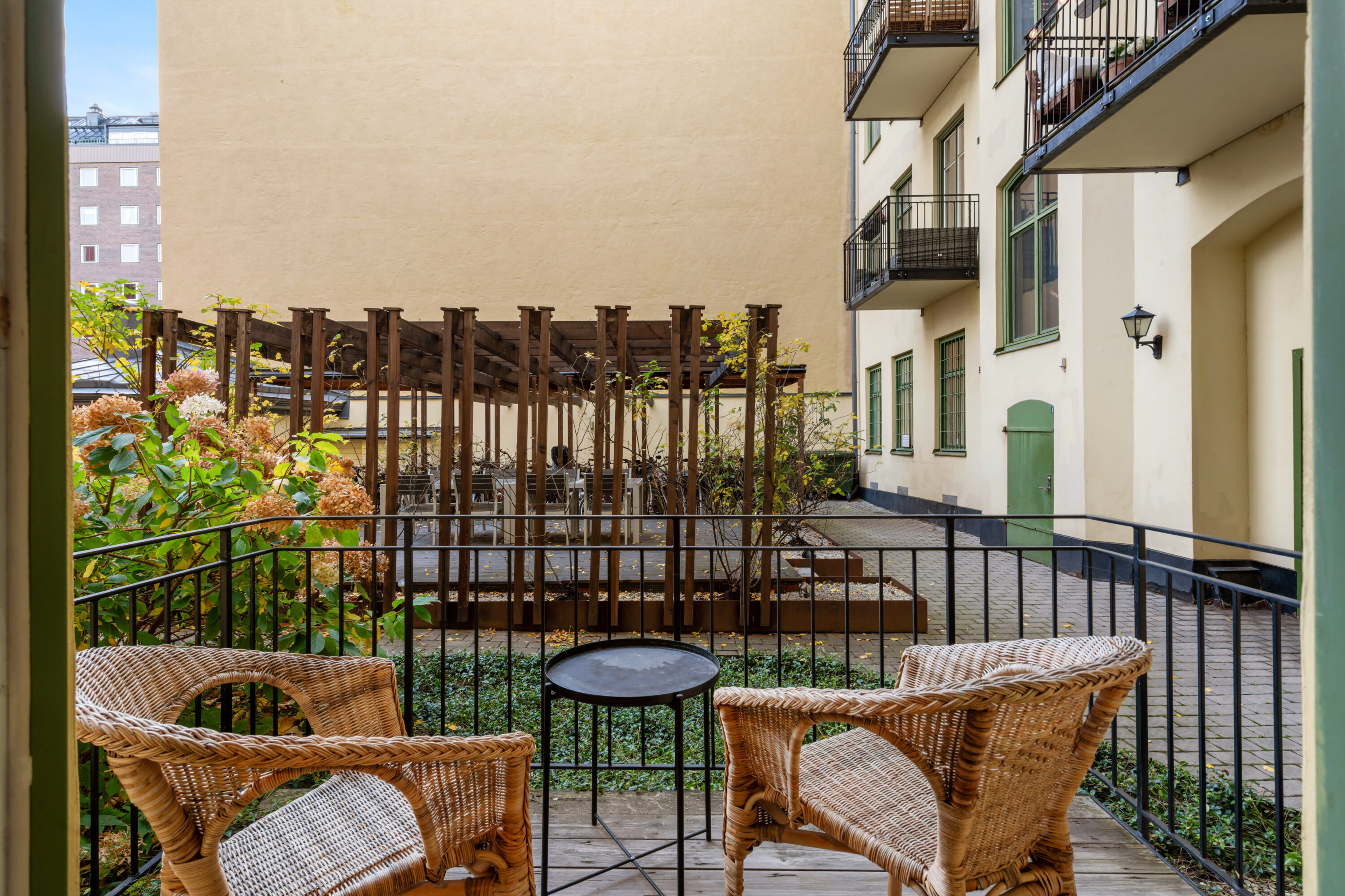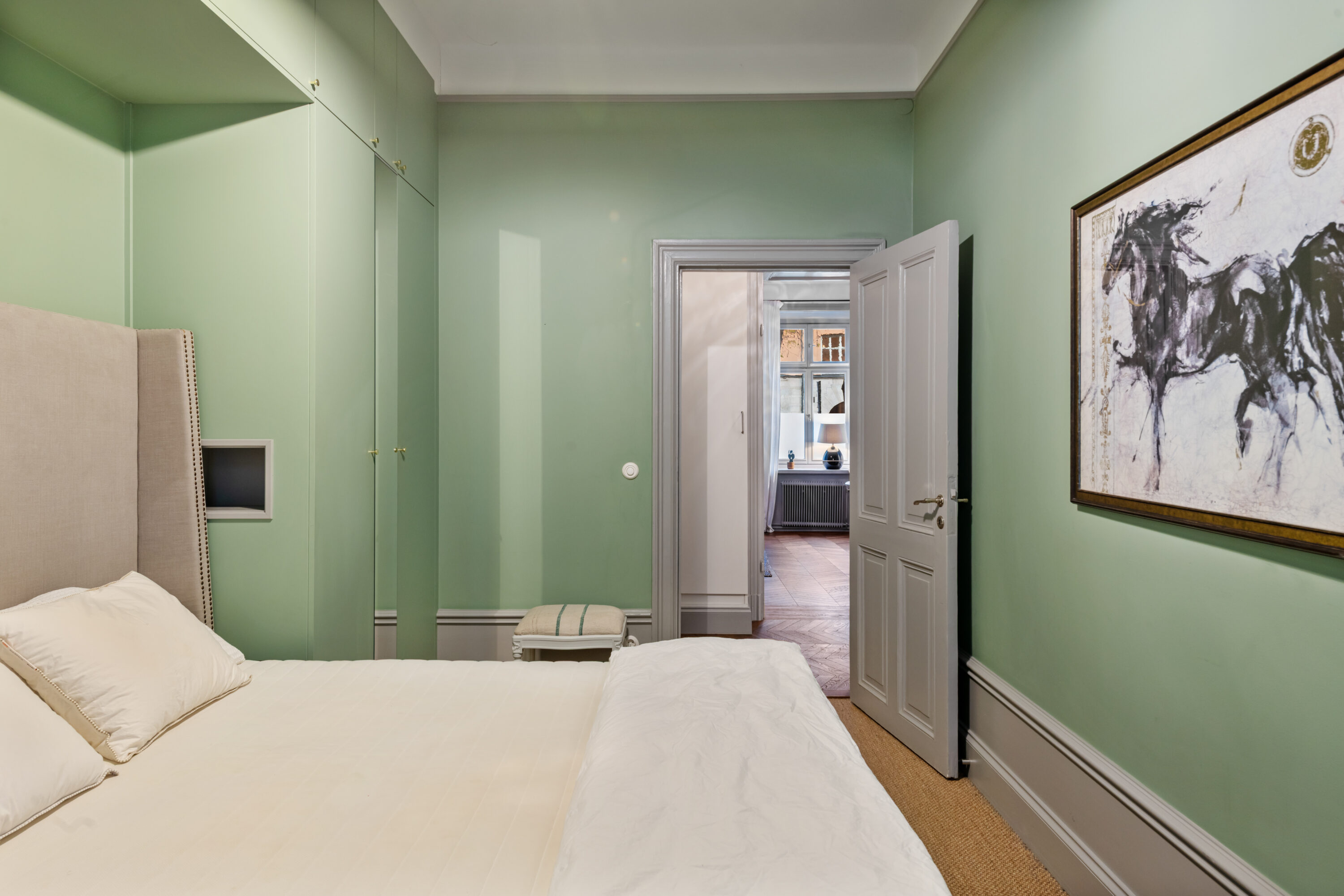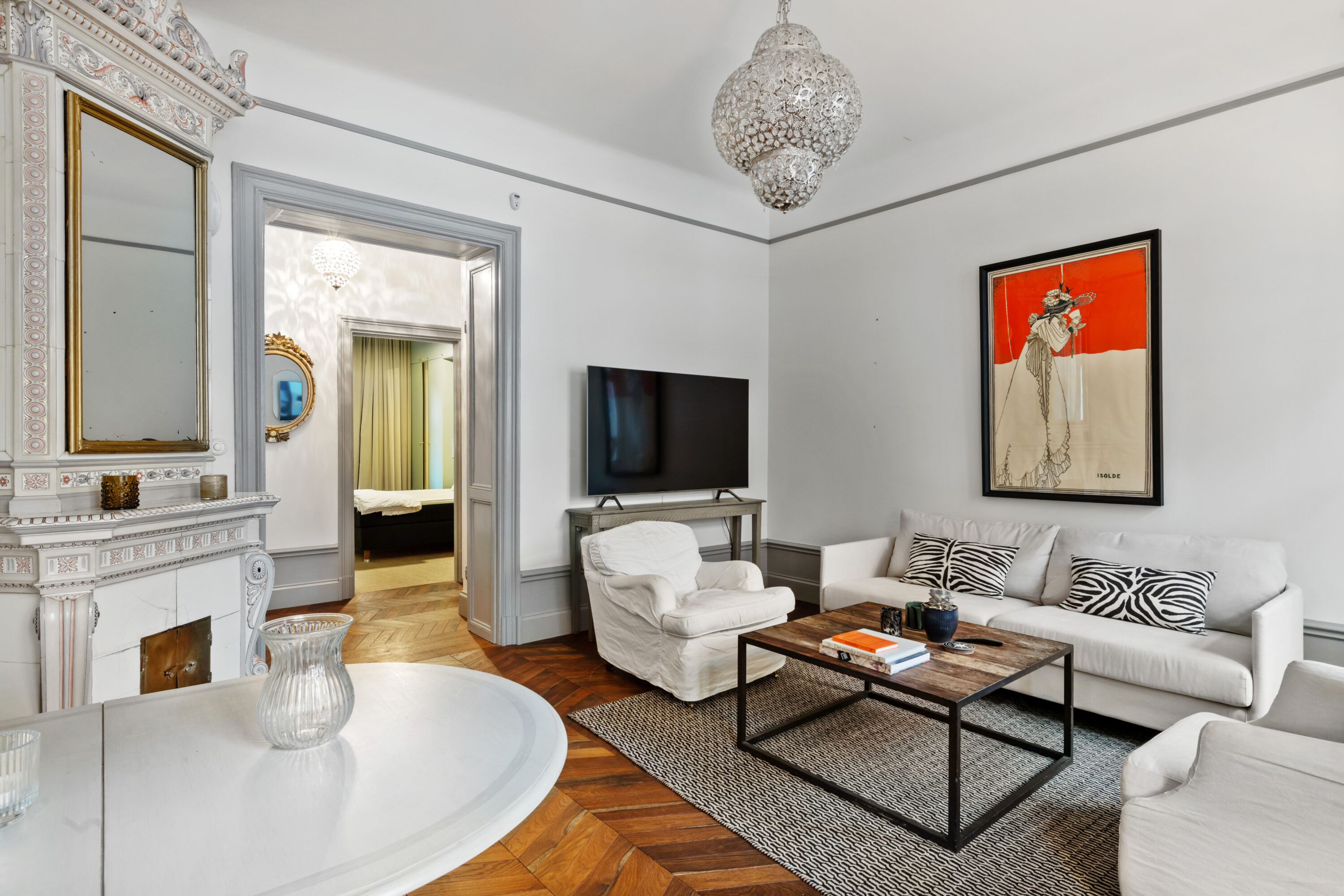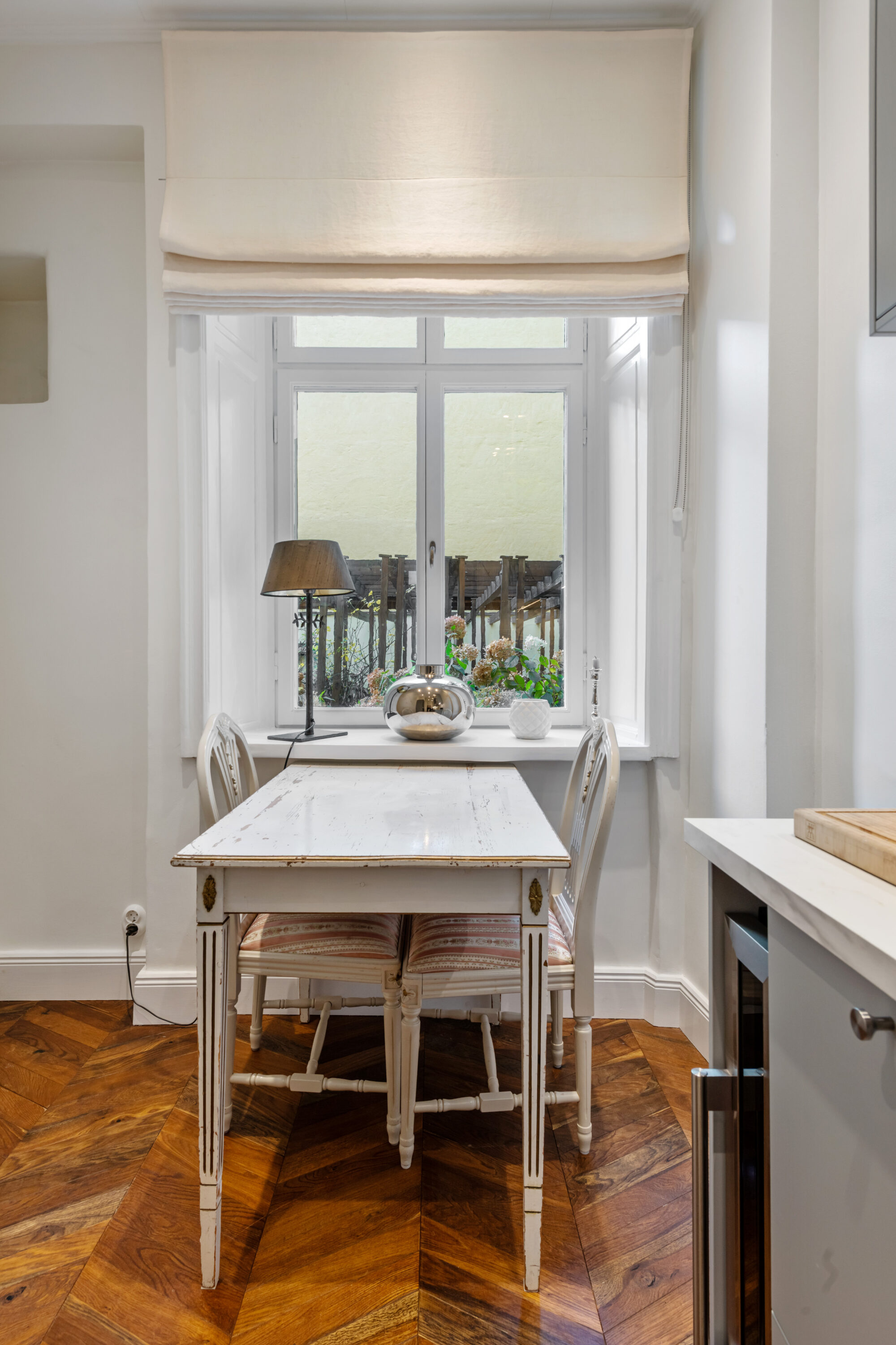 Bostaden har generös takhöjd, fiskbensparkett, spegeldörrar och en vacker kakelugn som skapar rätt känsla redan i vardagsrummet där det finns gott om plats för både soffgrupp och matplats samt en naturlig tv‑vägg. Det rofyllda sovrummet vetter mot gården och är inrett med platsbyggd förvaring runt sängen, spegelpartier som ger rymd och utgång till en trivsam liten uteplats/fransk balkong mot föreningens innergård där två rottingfåtöljer ryms för morgonkaffet. Köket är ett effektivt arbetskök i sober grå ton med lång bänkyta, induktionshäll, inbyggnadsugn, bra förvaring bakom släta luckor och ett tidlöst vitt kakel i tegelmönster, allt samlat längs ena väggen för optimalt arbetsflöde. Badrummet är helkaklat i ljusa naturtoner med glasad duschhörna, takdusch, kommod med förvaring och handdukstork. Den välkomnande hallen erbjuder bra avhängning och skoställ samt vackra snickerier i grått som binder ihop bostadens färgsättning. Lägenheten hyrs ut möblerad och passar utmärkt för singel eller par som vill bo representativt nära city, restauranger och kommunikationer samtidigt som man har lugnet mot gård. Välkommen att höra av dig vid intresse eller frågor.