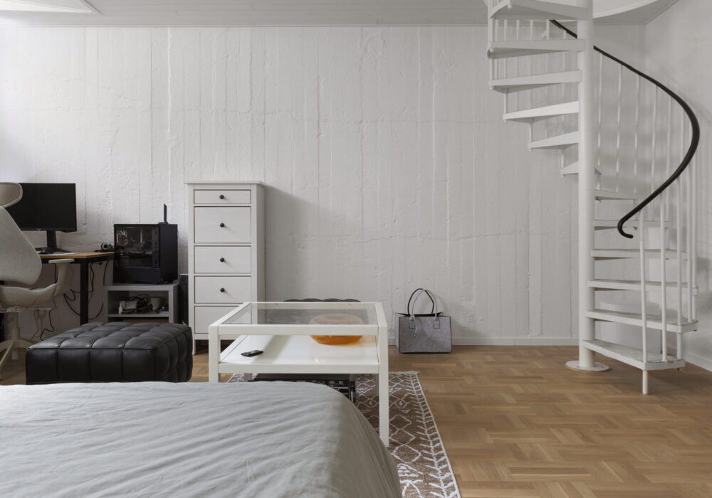 A white spiral staircase leads down to the generous bedroom that has space for a double bed, desk and good storage. Down here there is also a small lounge area or home office for those who want their own corner to unwind in.