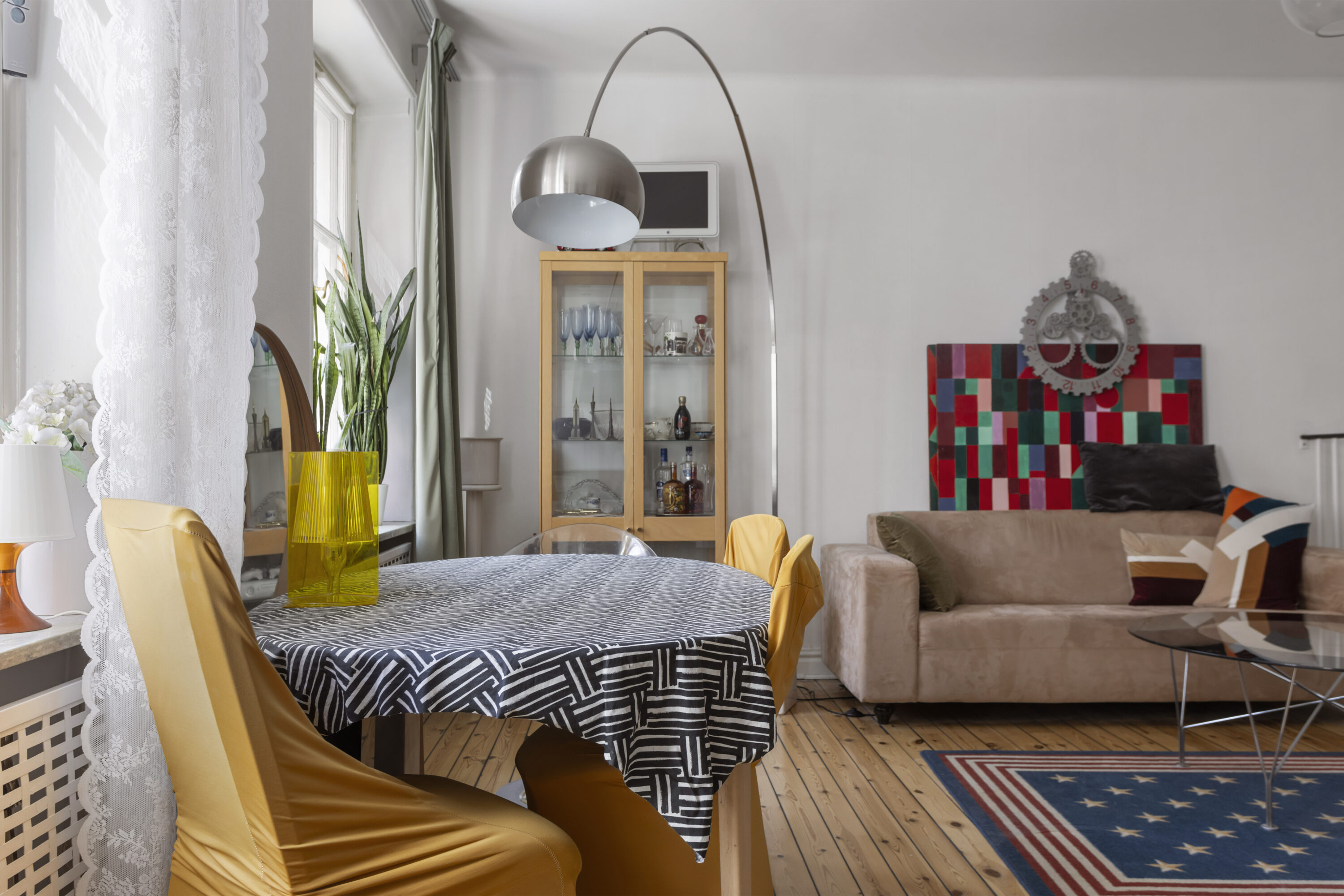 The apartment has a floor plan that really stands out and offers a nice mix of style and function. On the upper level you will find a stylish and modern kitchen with plenty of work space, stainless steel appliances and a warm wooden worktop that provides a lovely contrast to the white cabinets. The living room is bright and airy with a large window that lets in lots of daylight, perfect for relaxed evenings at home. Wooden floors and charming details give the room an inviting feel. The bathroom is fresh and stylish with white tiled walls, green tiles in the shower and nice brass details.
