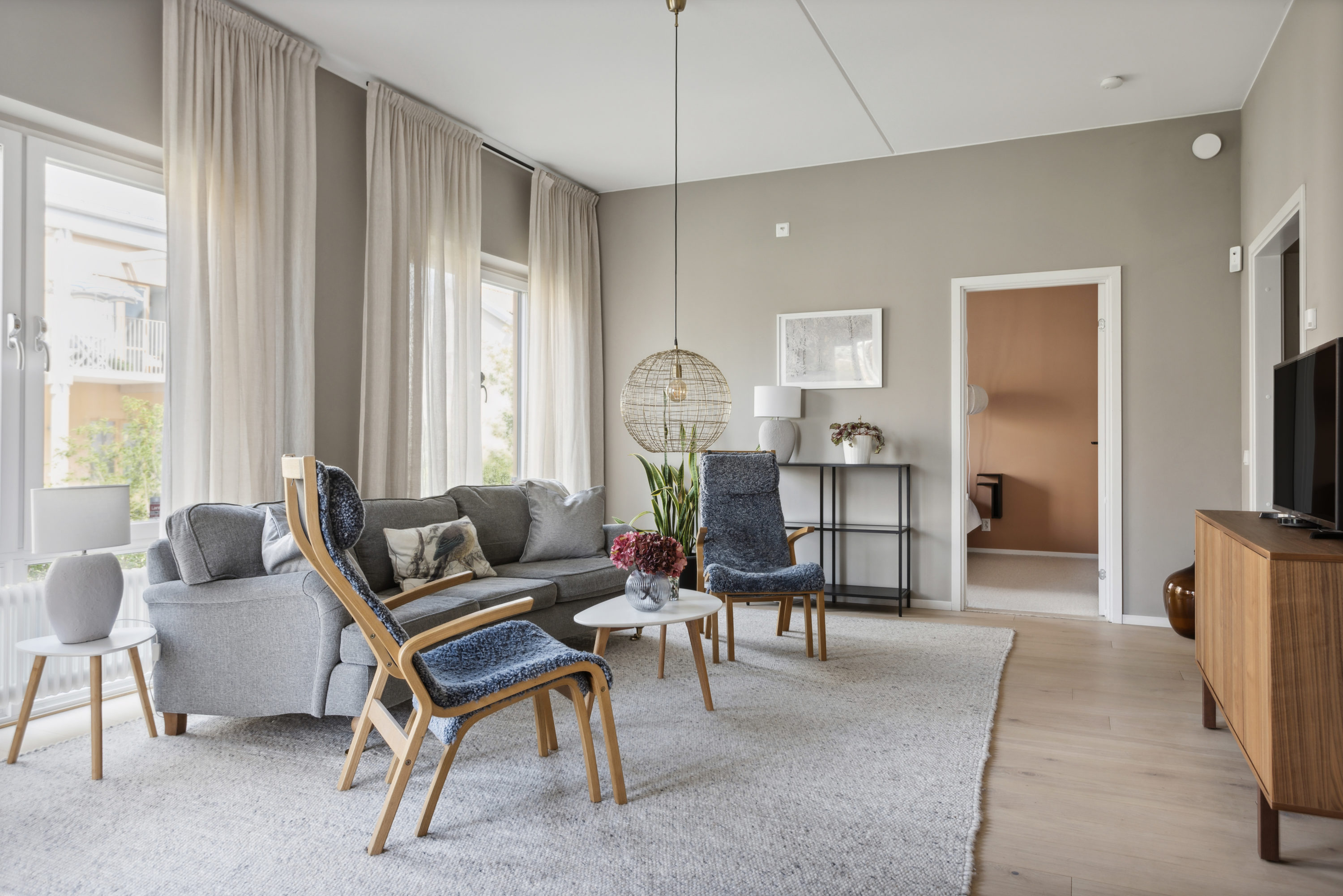 Corner apartment offering that little extra in Näsby Slottspark. The apartment was built in 2020 and is optimally designed with plenty of storage. It has a generous ceiling height, good light from windows in three directions, and a paved patio where you can enjoy the evening sun. All color and material choices are of high standard. The apartment has two bedrooms, a fully equipped kitchen, a living room, and a bathroom with a combined washer and dryer.