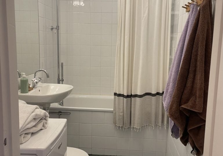 if you want. The bathroom is fresh and fully tiled with a bathtub and washing machine, very