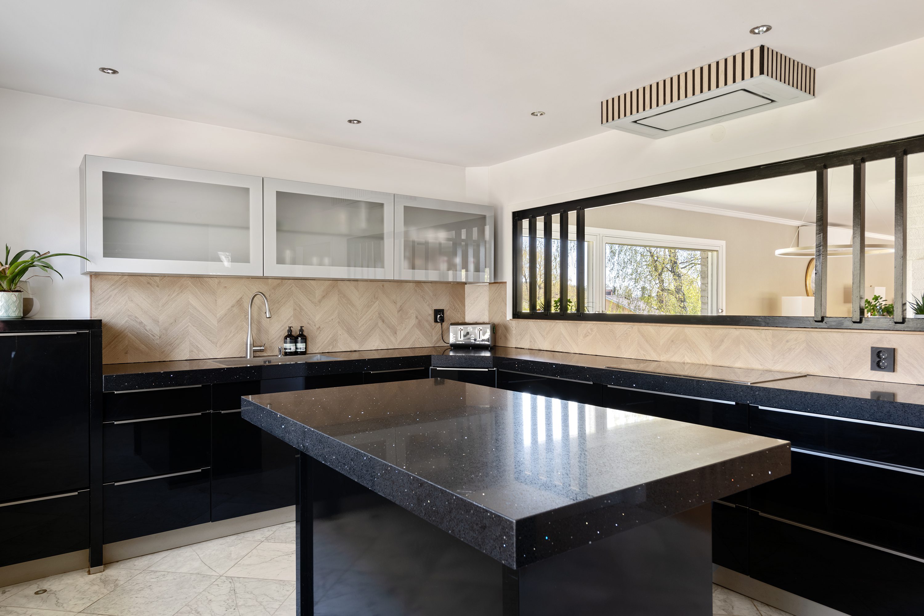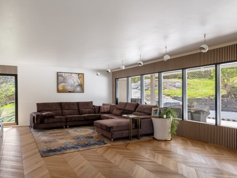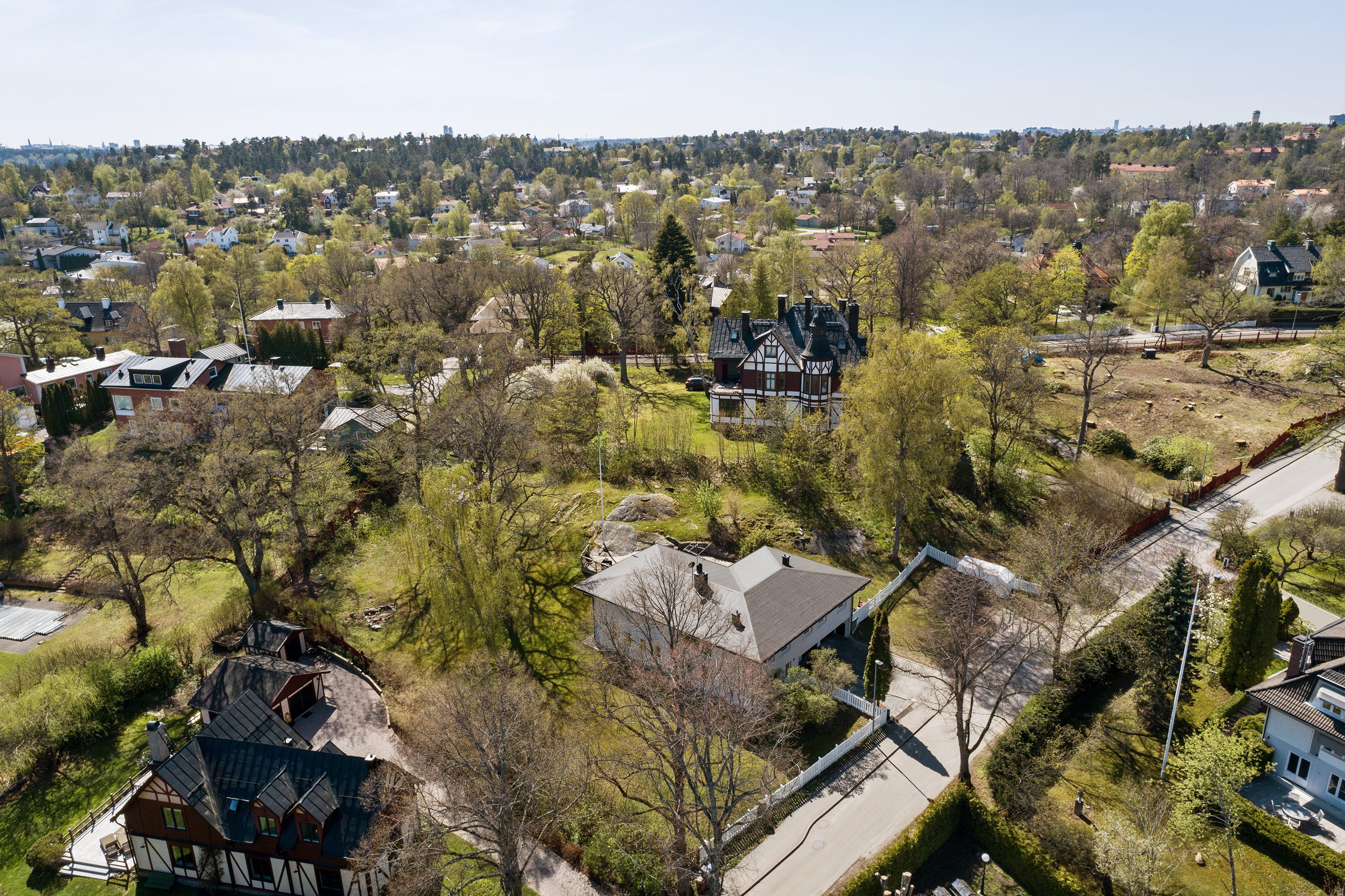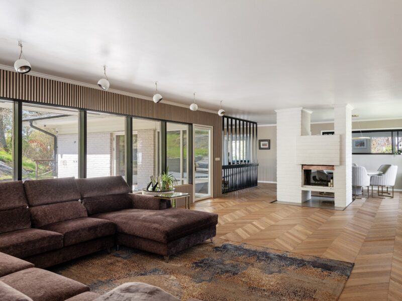 A newly renovated villa with a lake is located in Djursholm. There are plenty of bedrooms and a wonderful social area with access to a southwest-facing patio with a pool. The lower floor consists of an entrance hall, a bedroom, a living room, and a bathroom. The upper floor consists of an open-plan kitchen, dining room, and living room. From the bedroom and the living room, you have a view of the terrace with a pool and greenery.