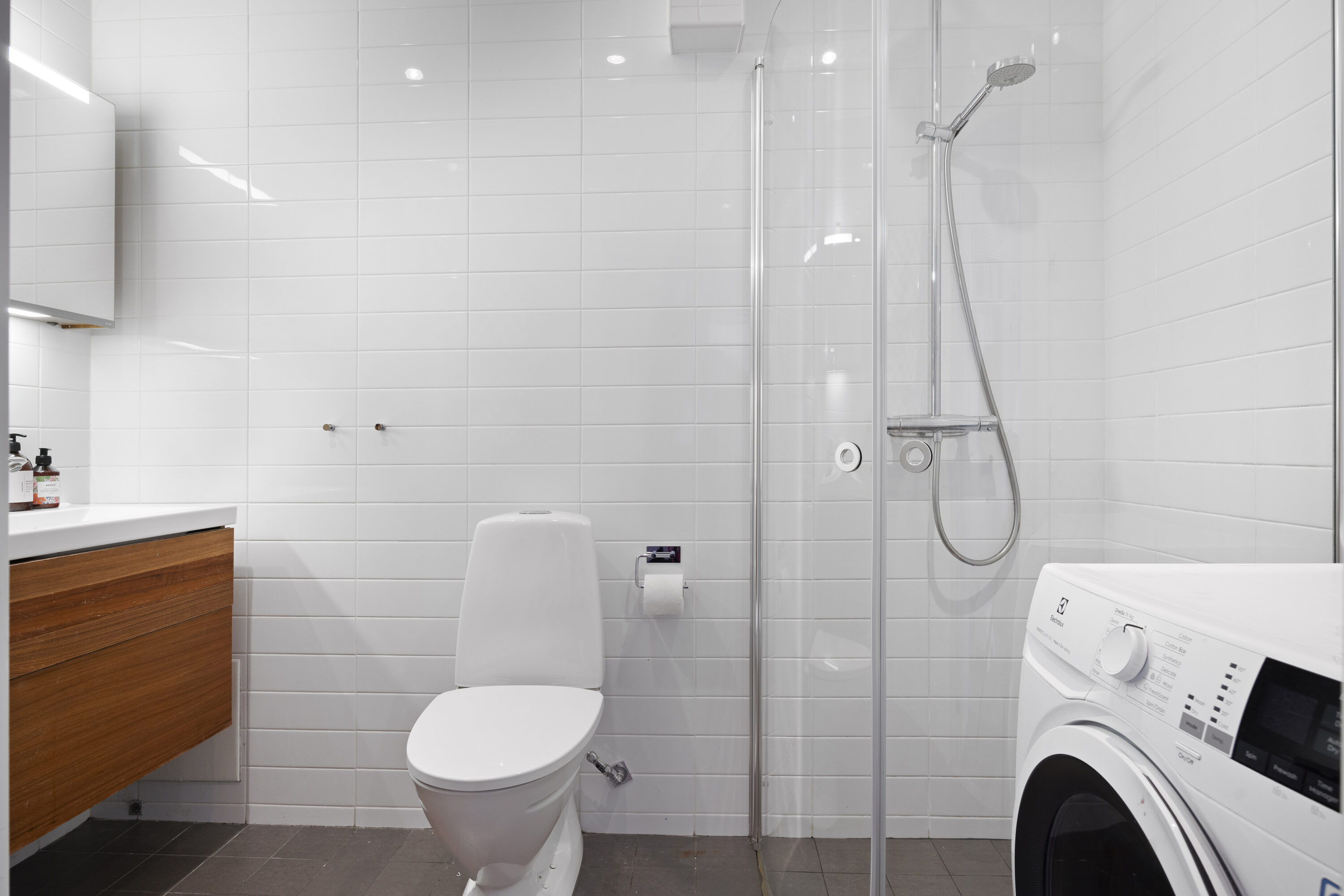 Två badrum, varav det ena med dusch, toalett och tvättmaskin, och det andra med separat wc,