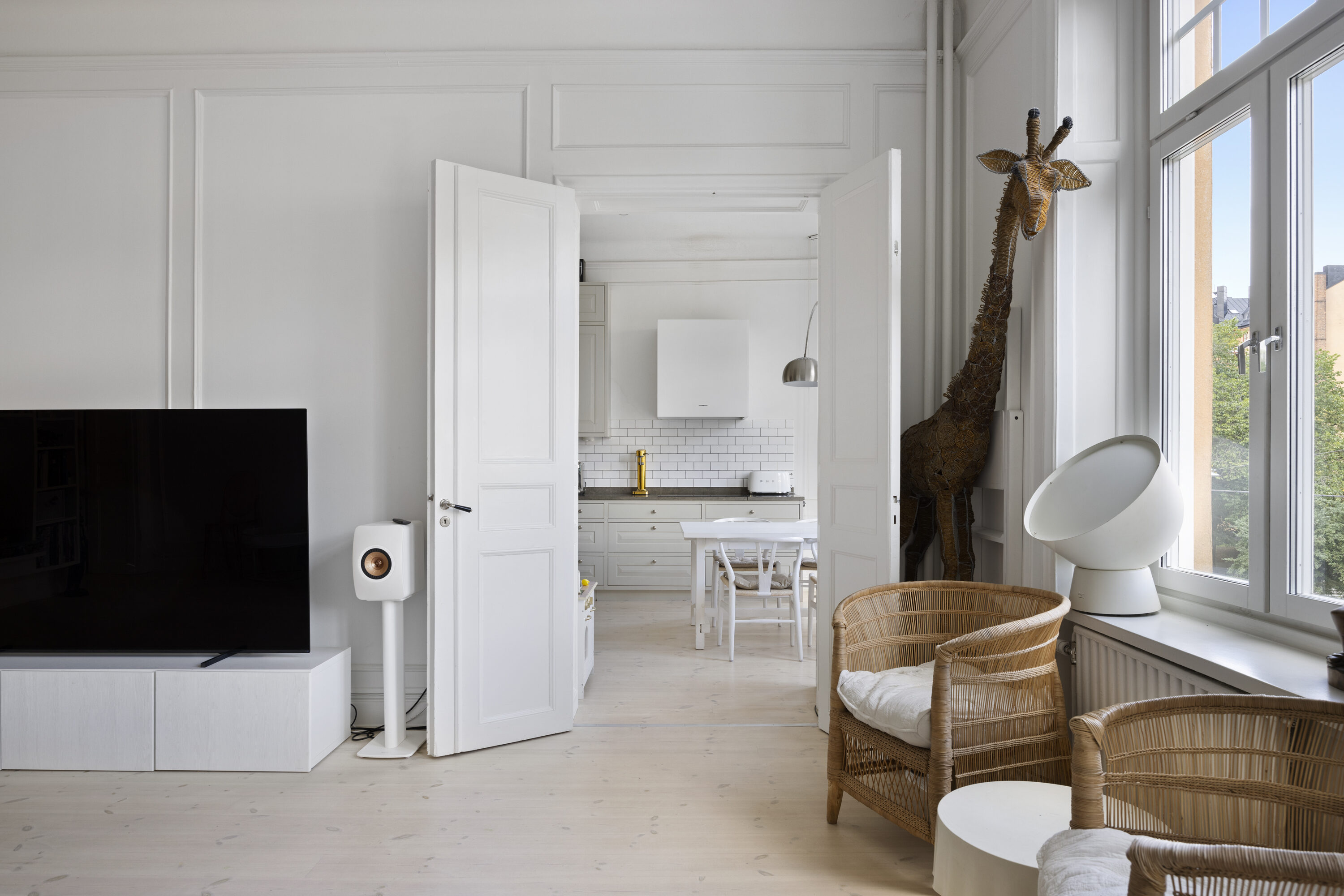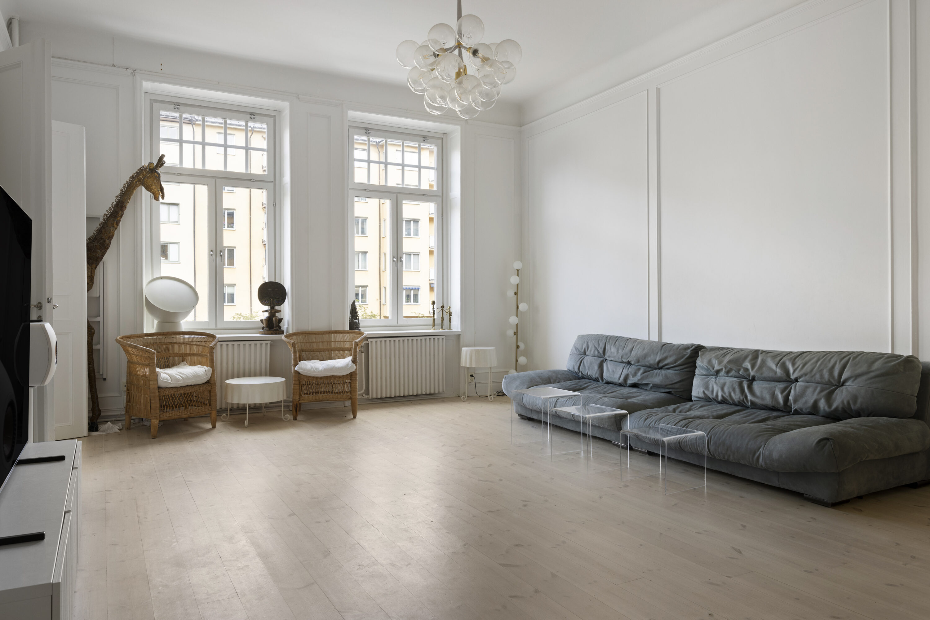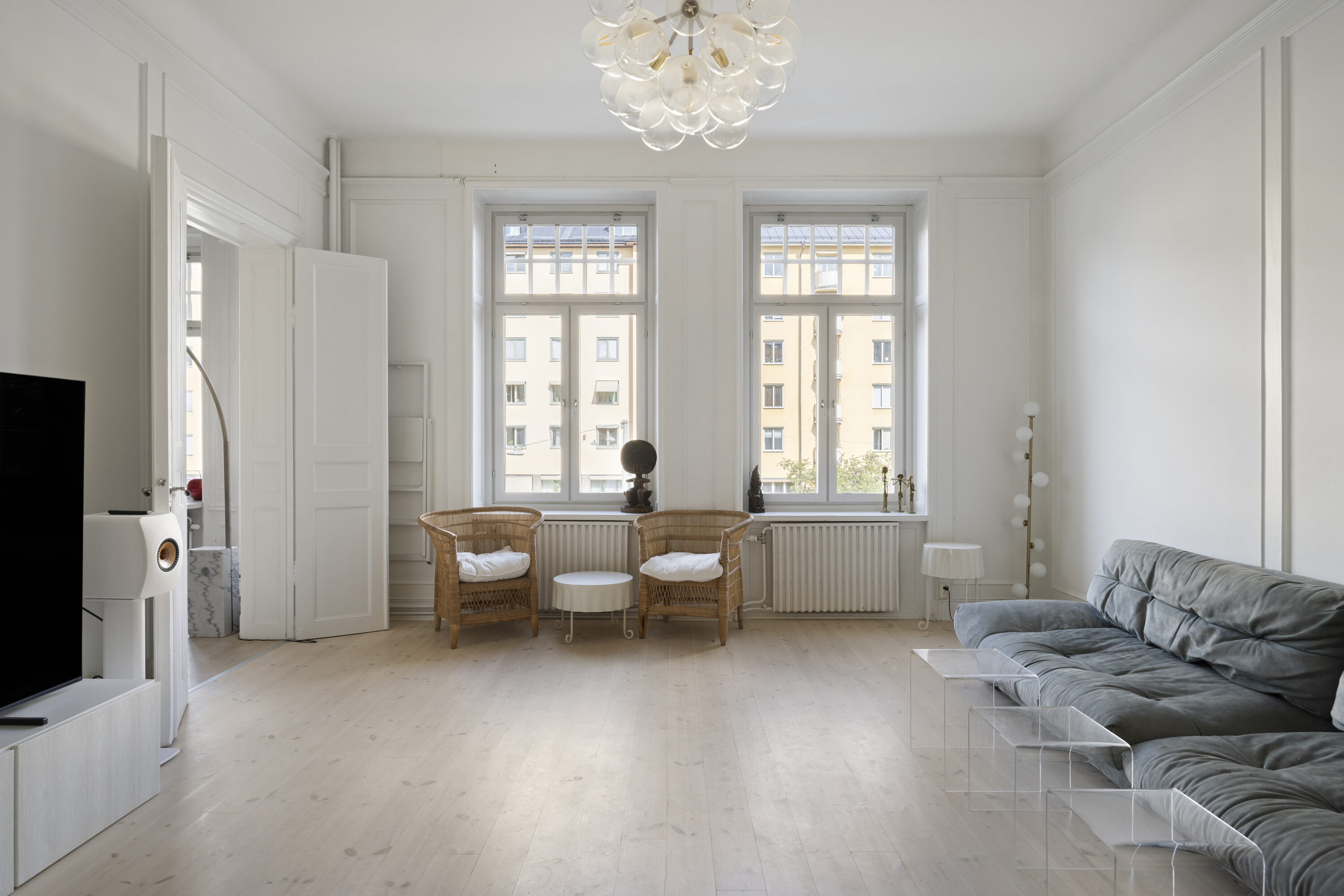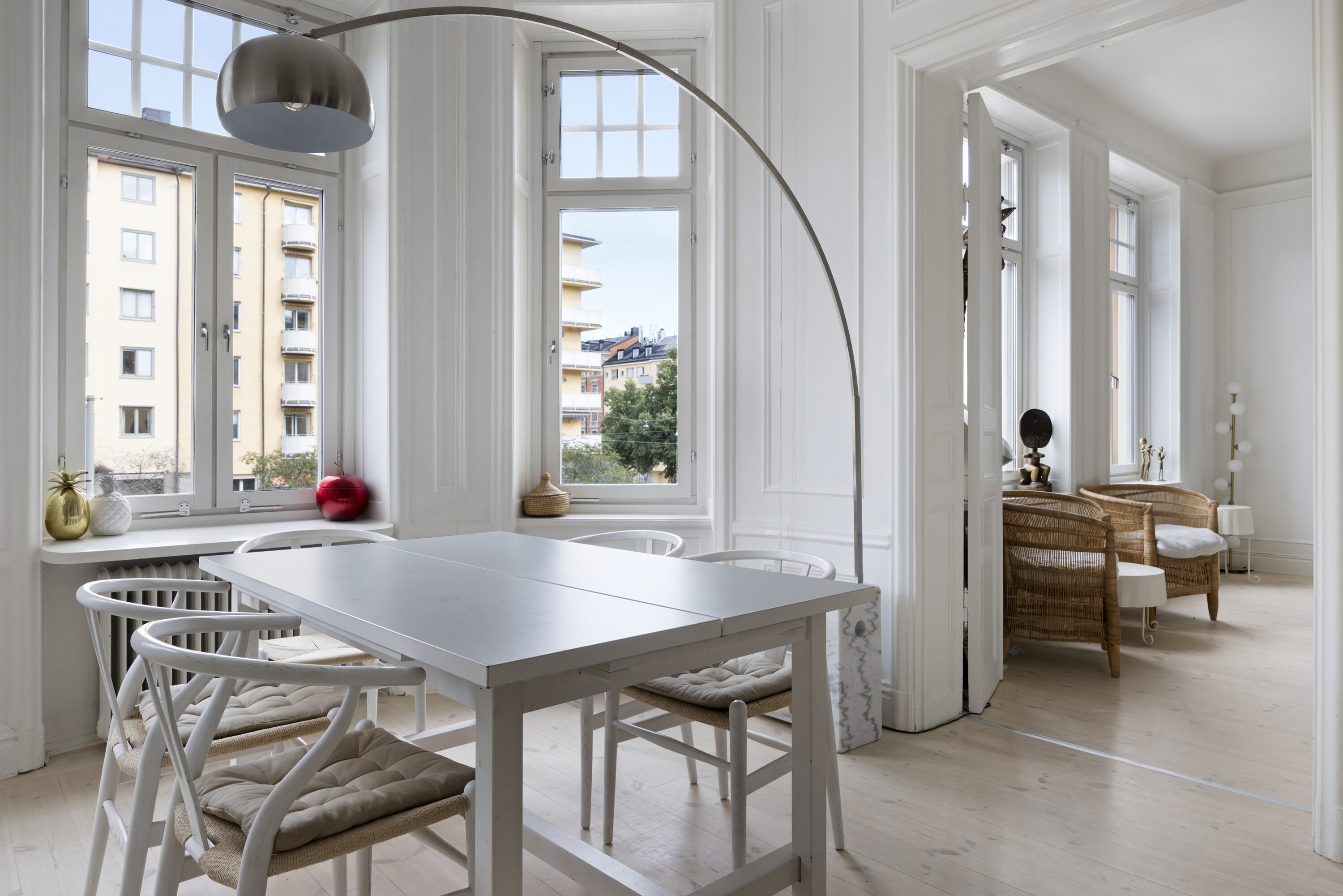 genomgående charmiga originaldetaljer såsom högt till tak, stora fönsterpartier, djupa