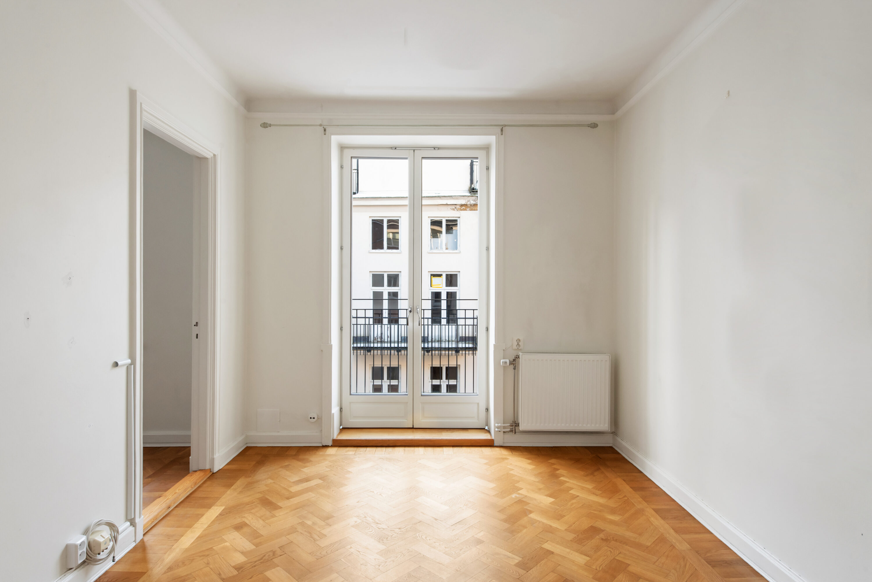 Vardagsrummet är luftigt med stilren fiskbensparkett, stora fönster och franska dörrar som
