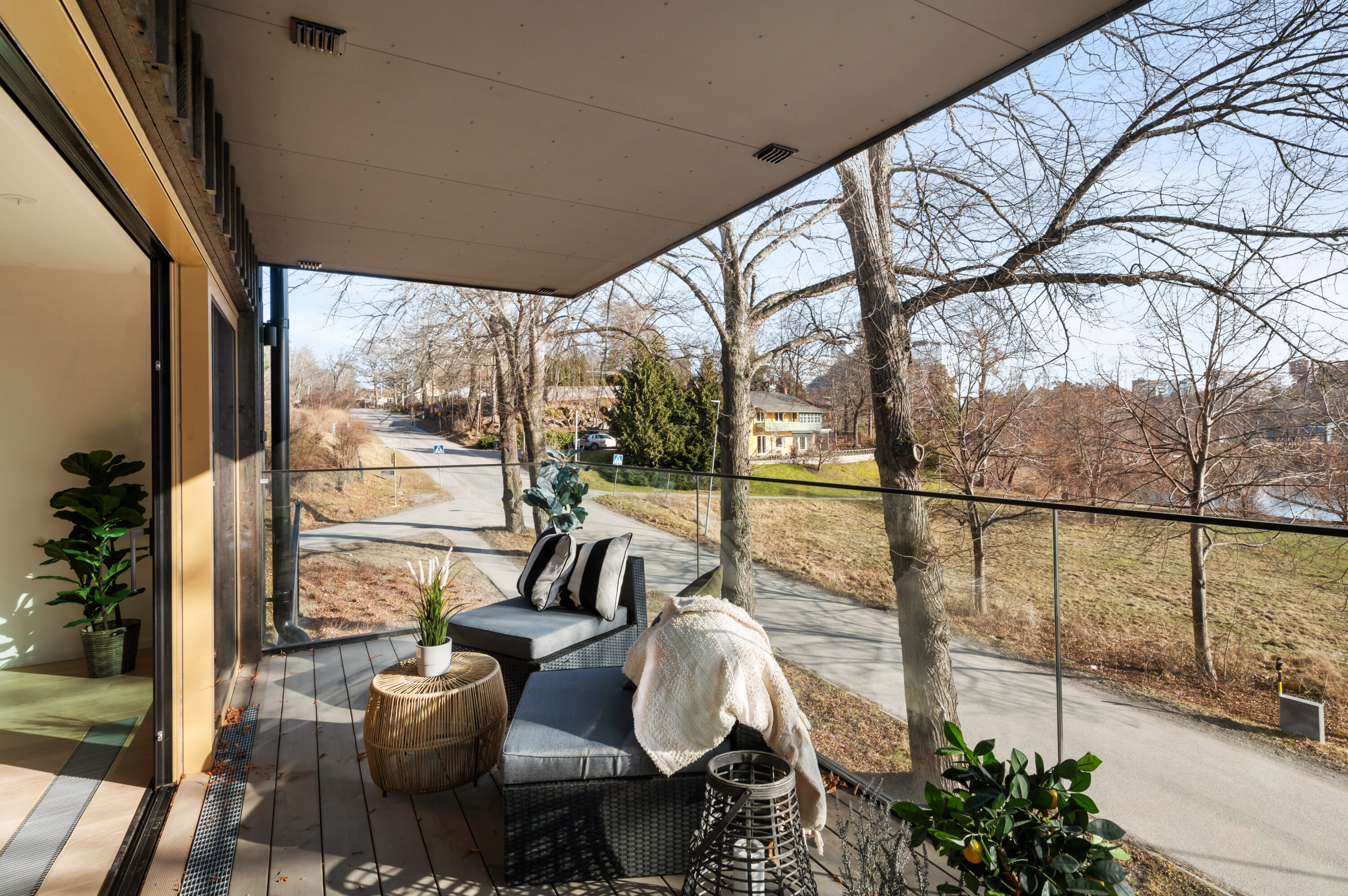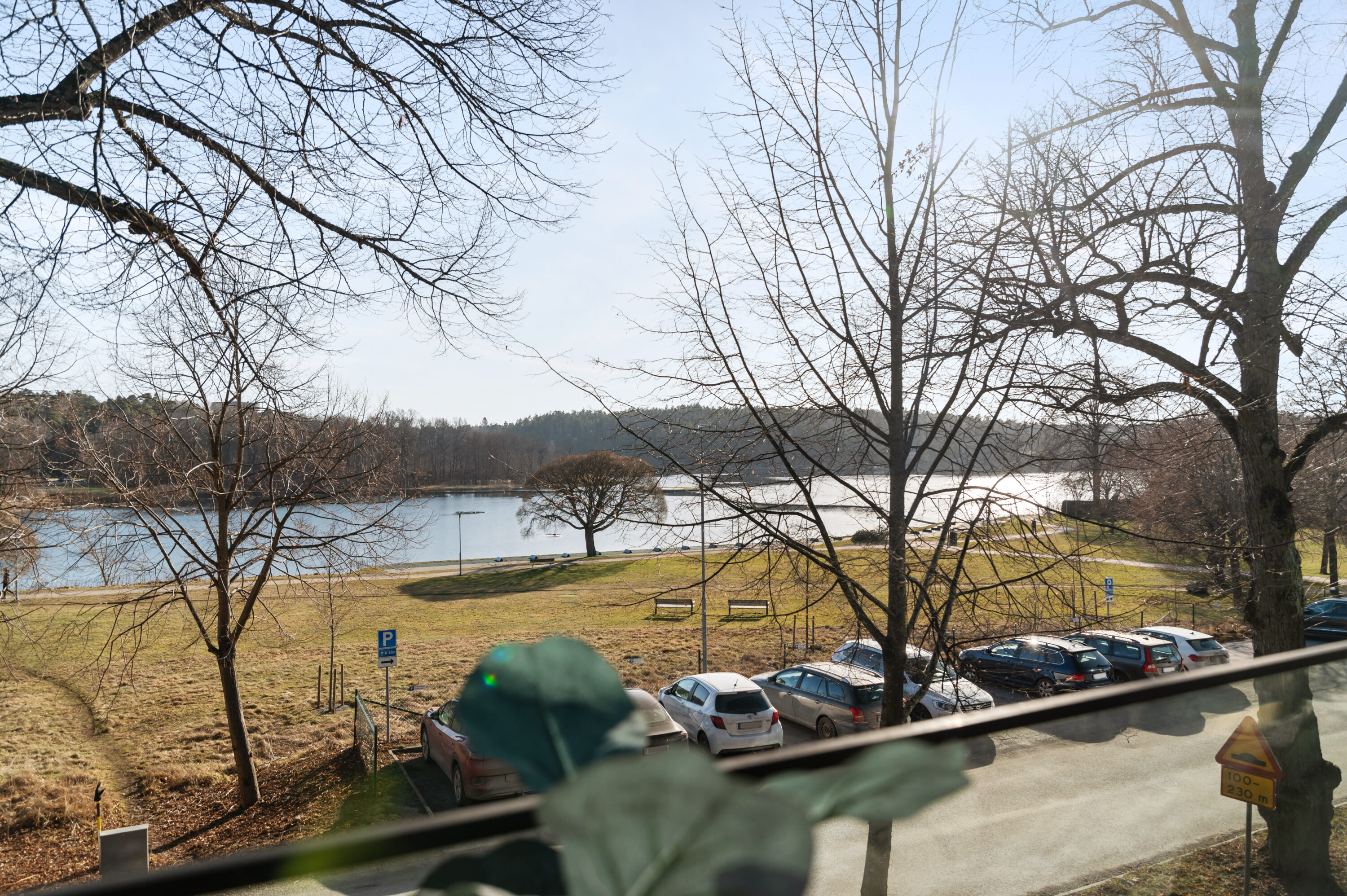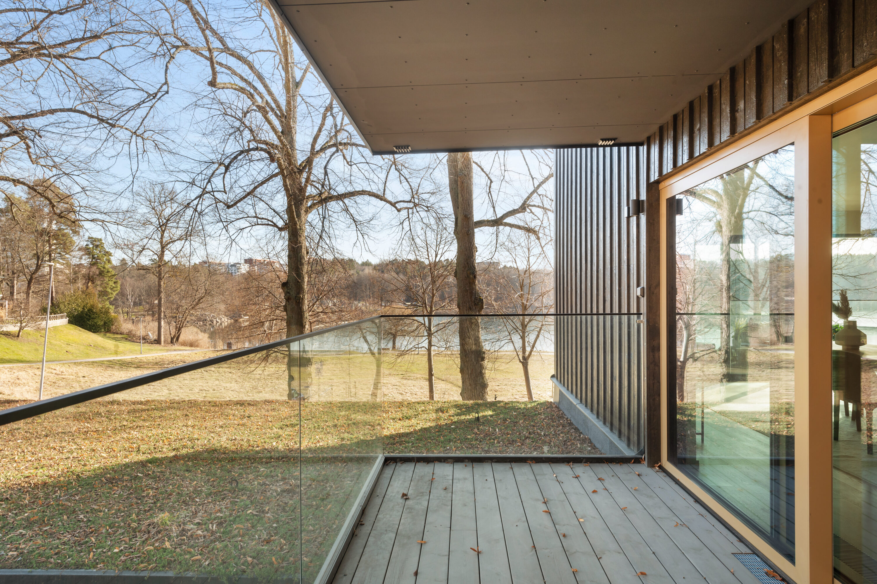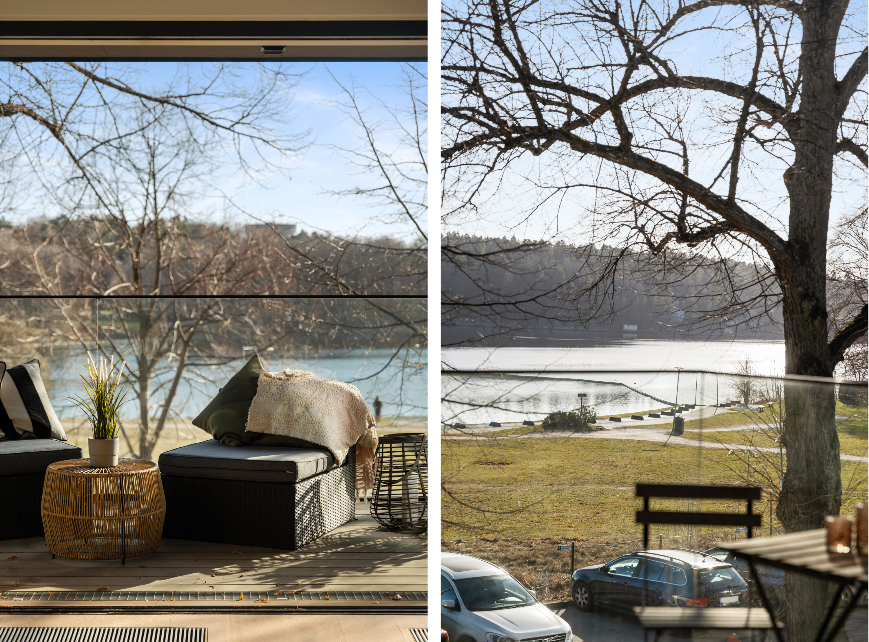 räcken för att inte ta fokus från utsikten över Edsviken. Utanför dörren finns parkering i