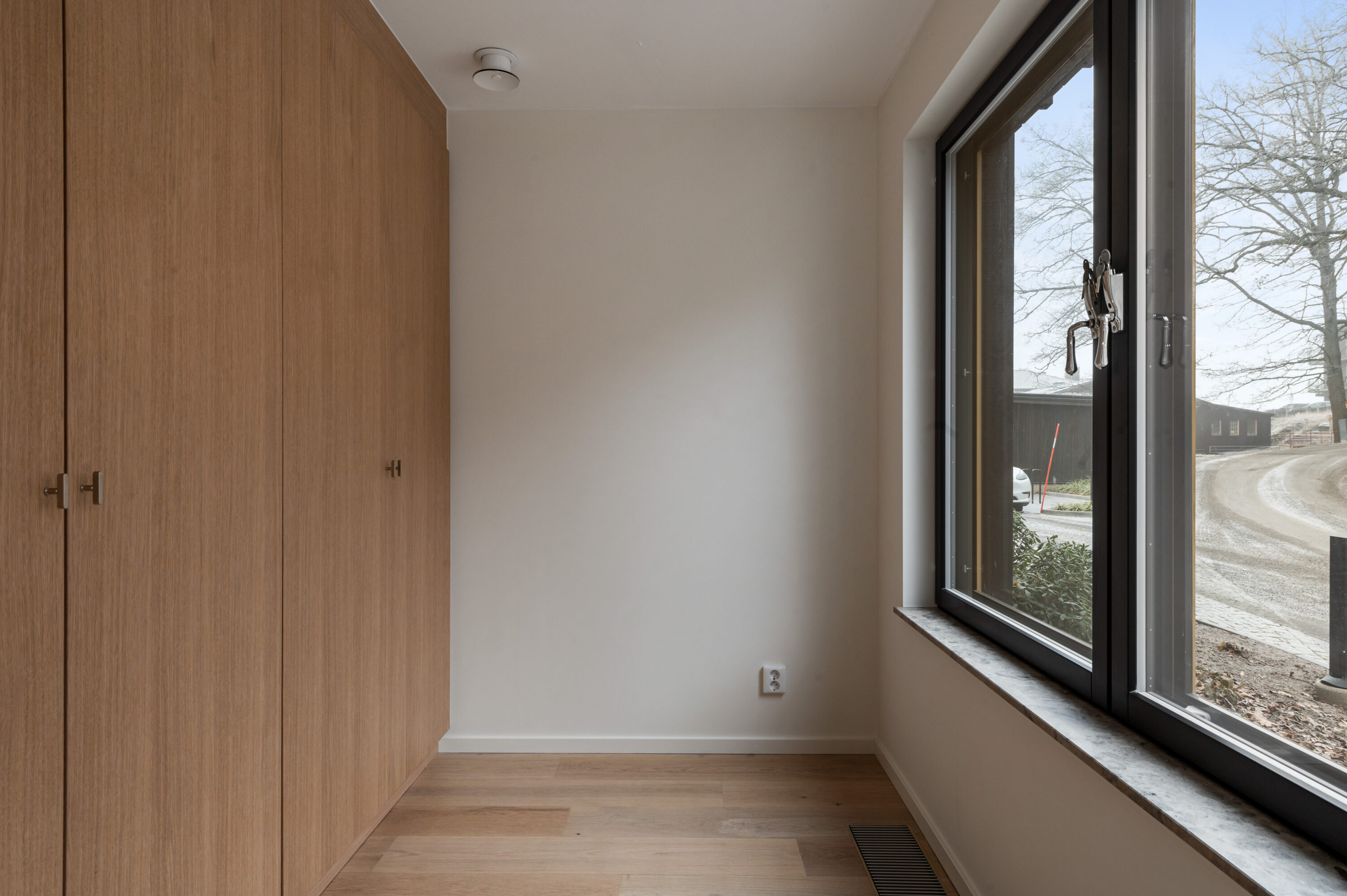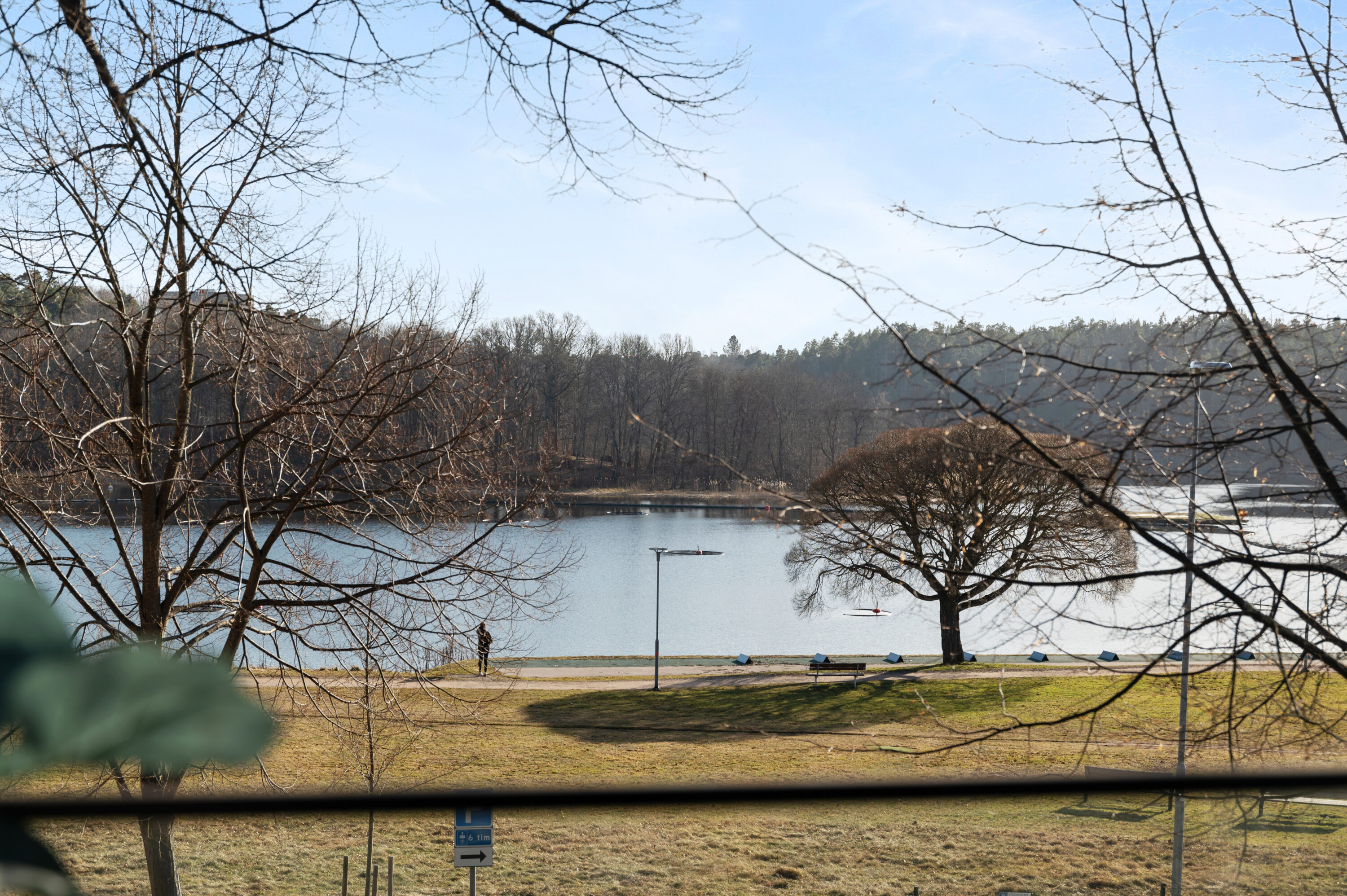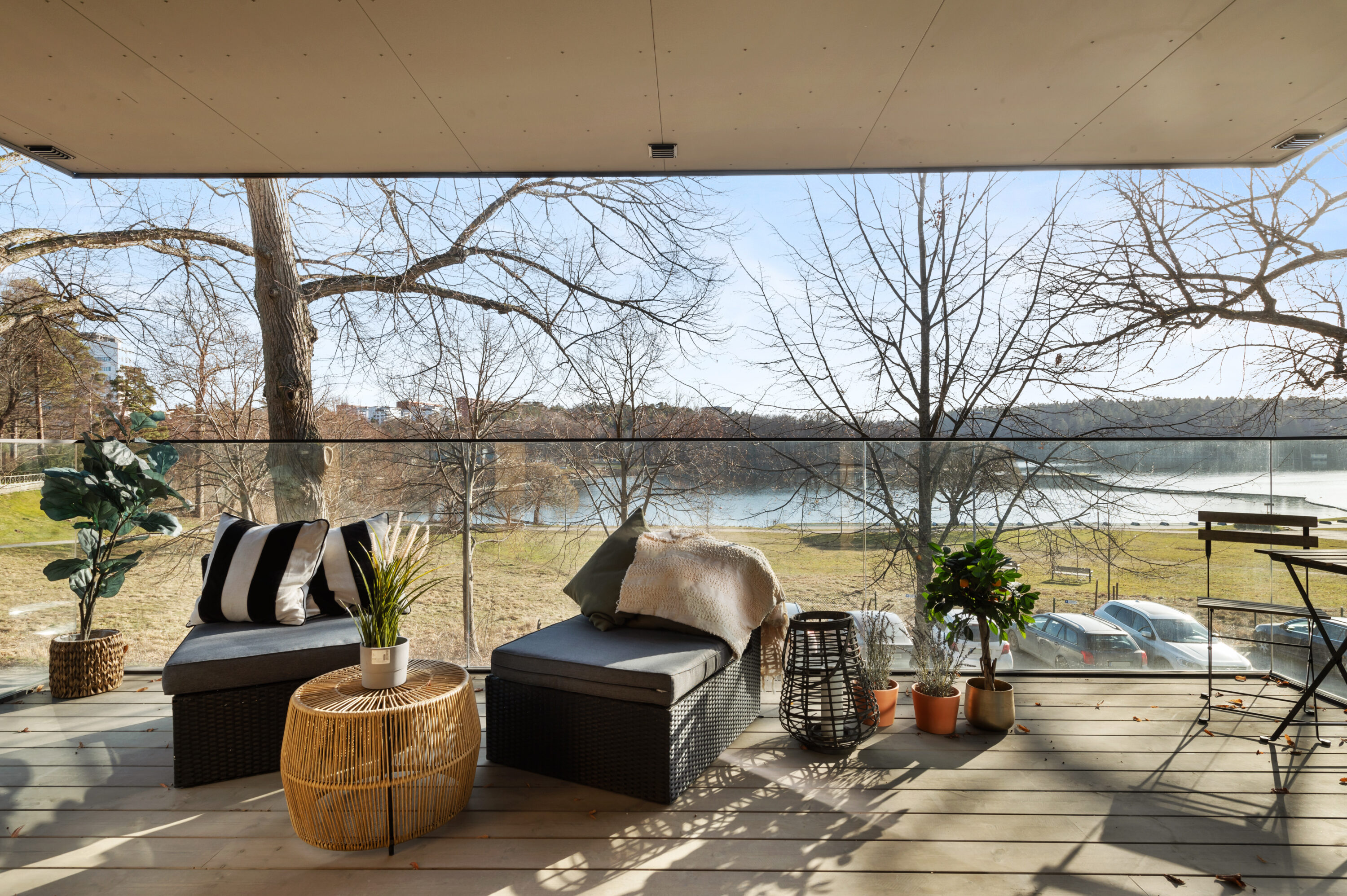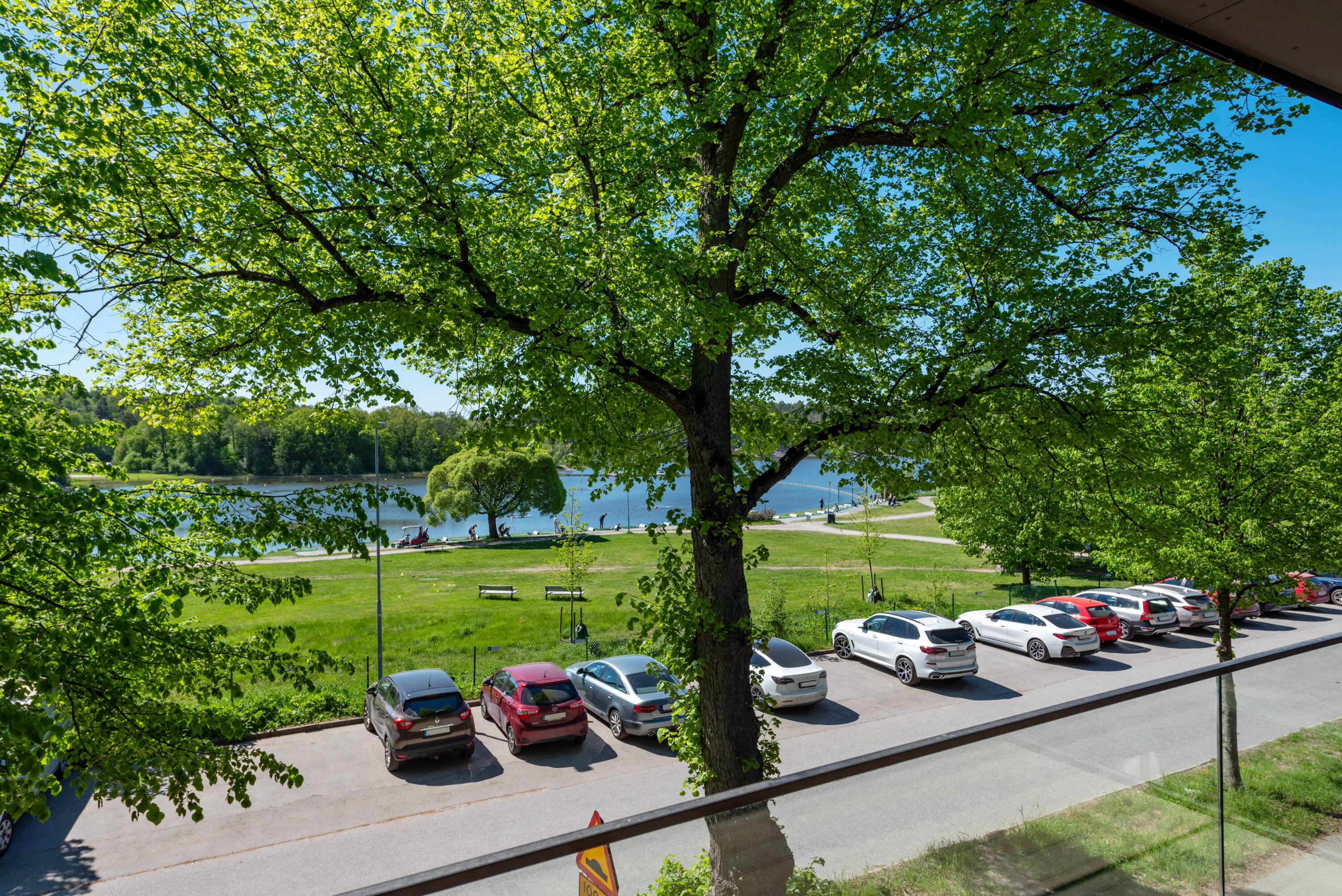 räcken för att inte ta fokus från utsikten över Edsviken. Utanför dörren finns parkering i