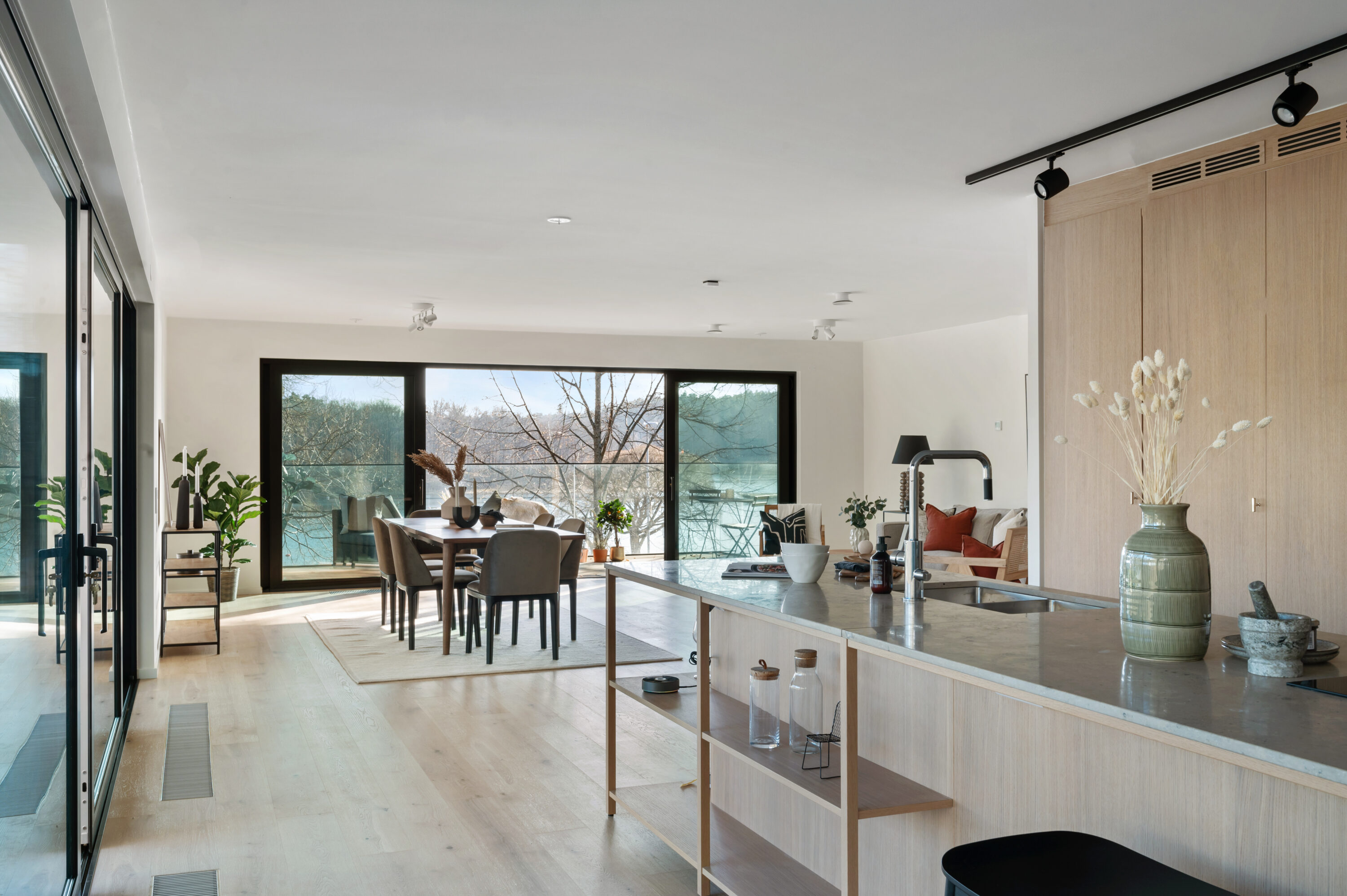 balkong i söderläge med sjöutsikt. Oavsett om man står vid spisen eller minglar vid köksön