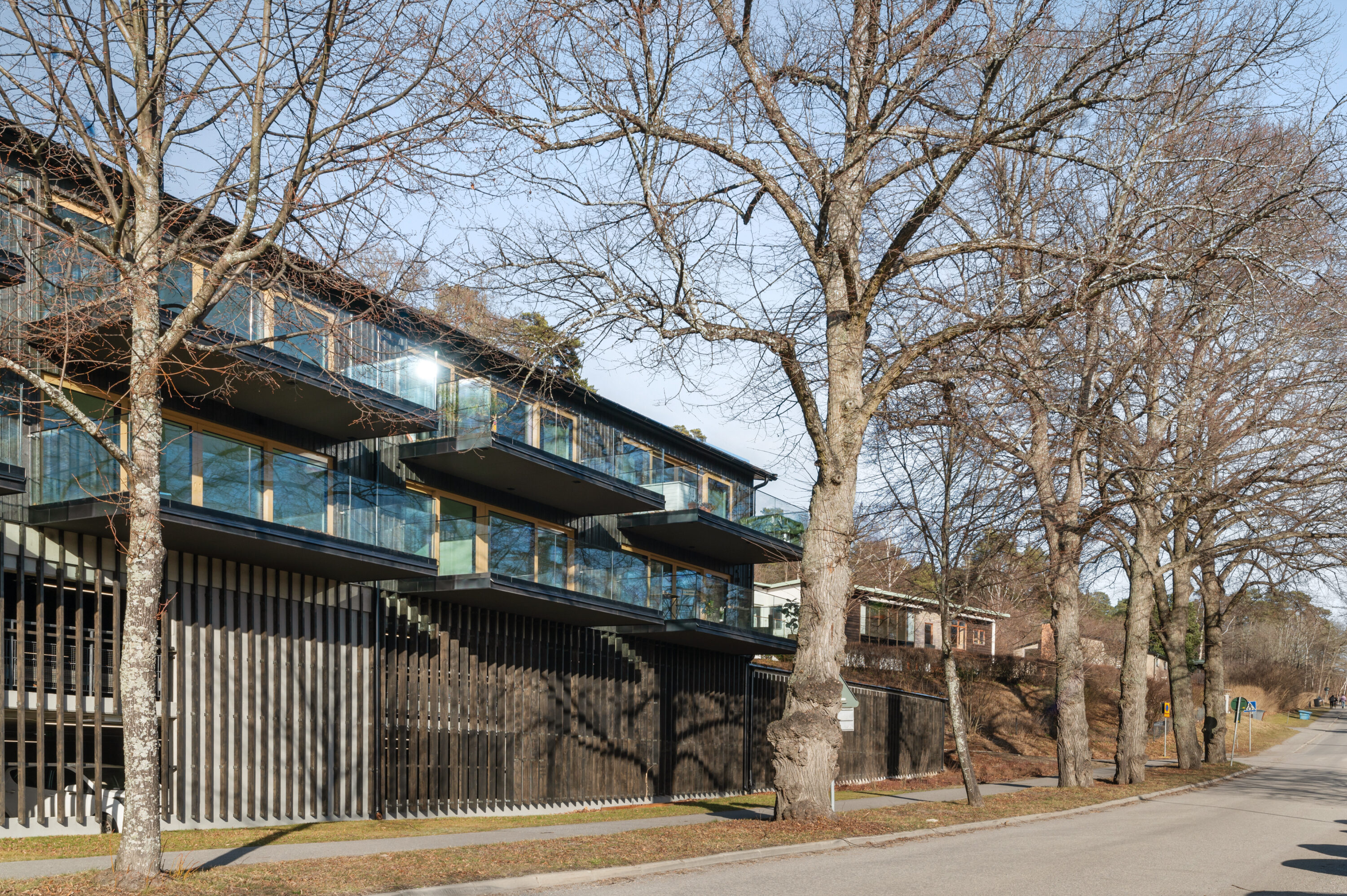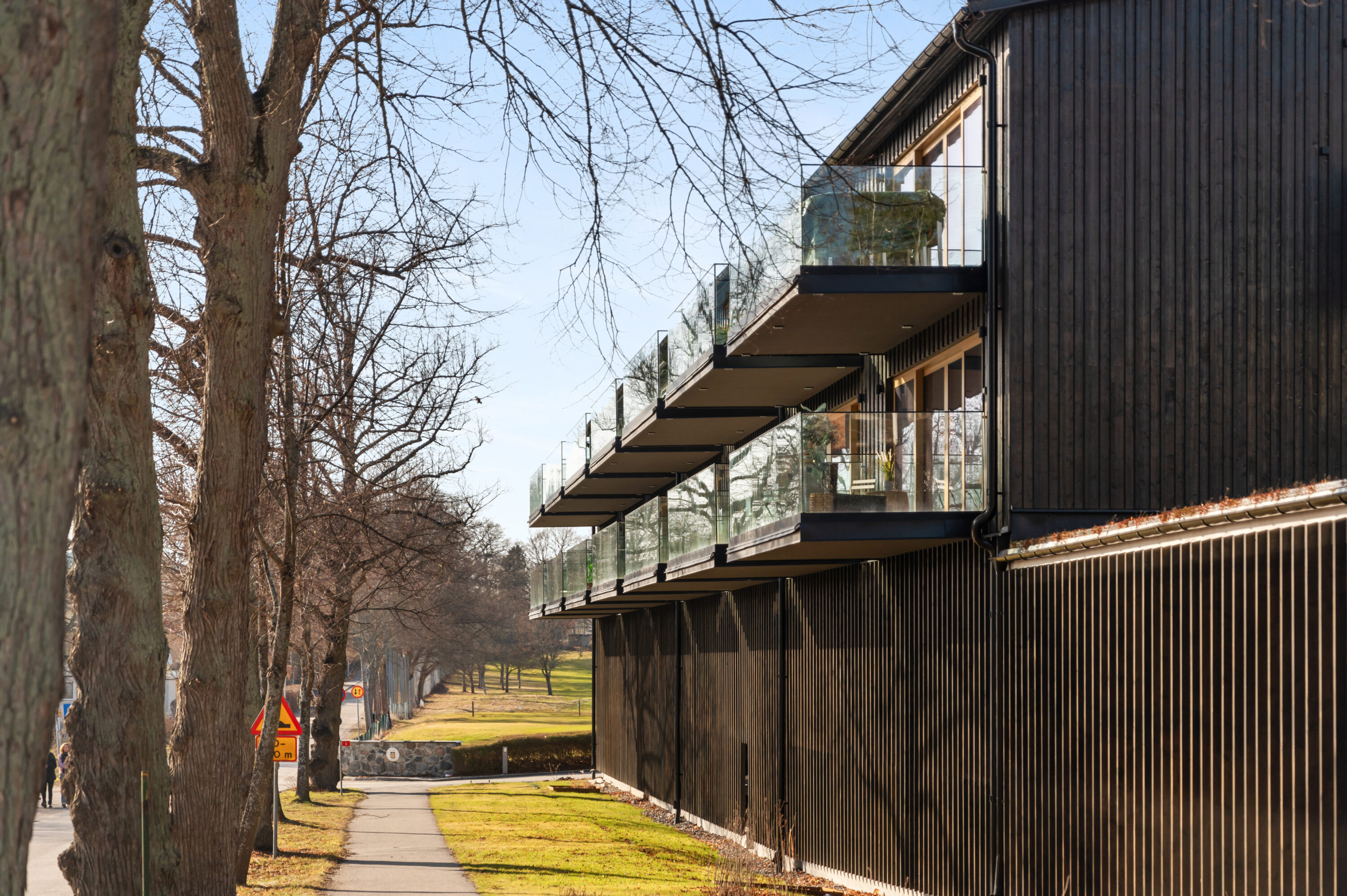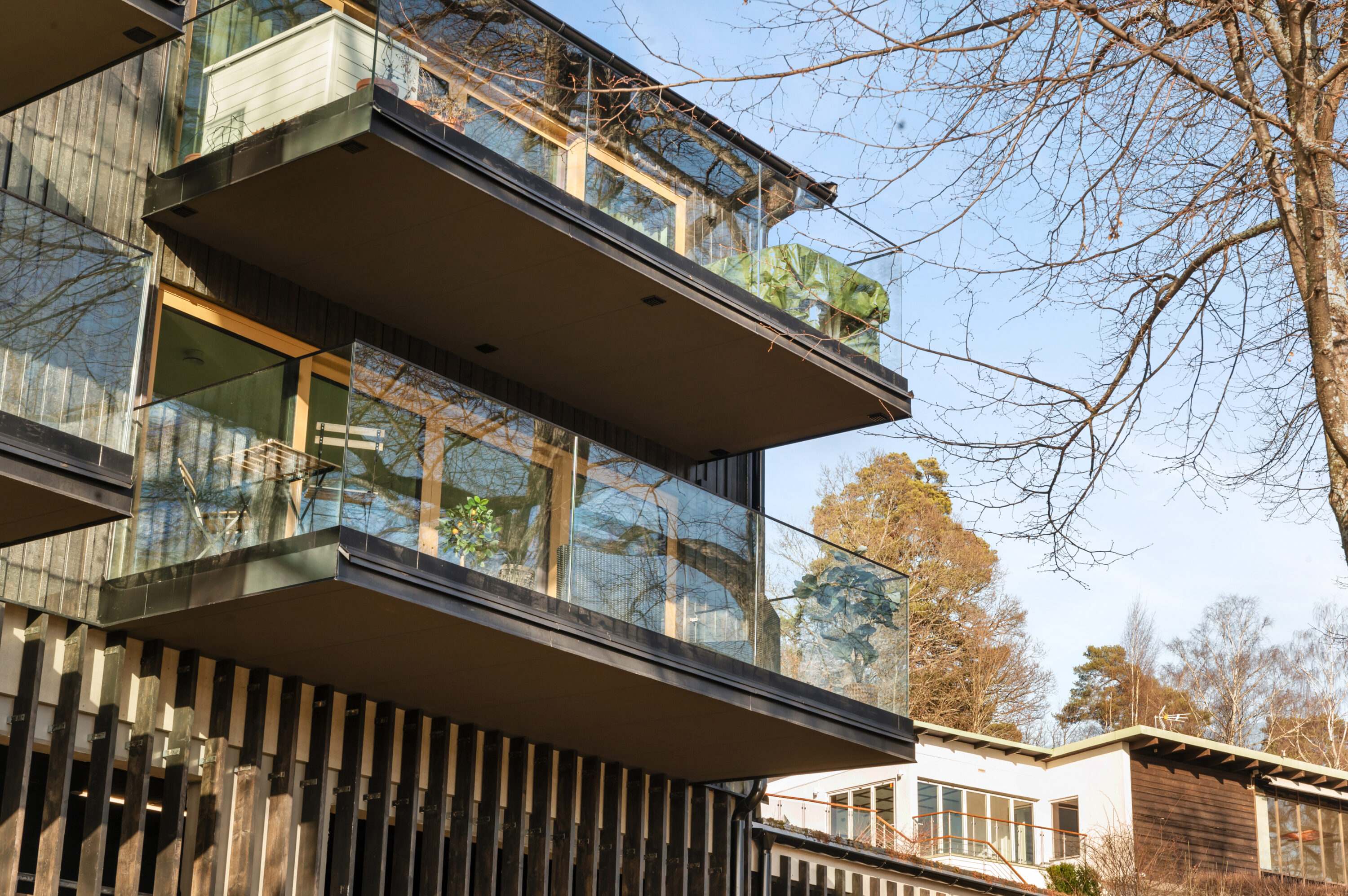 klubbhus som ligger strax bakom. Balkongerna har ett minimalistiskt formspråk med glasade
