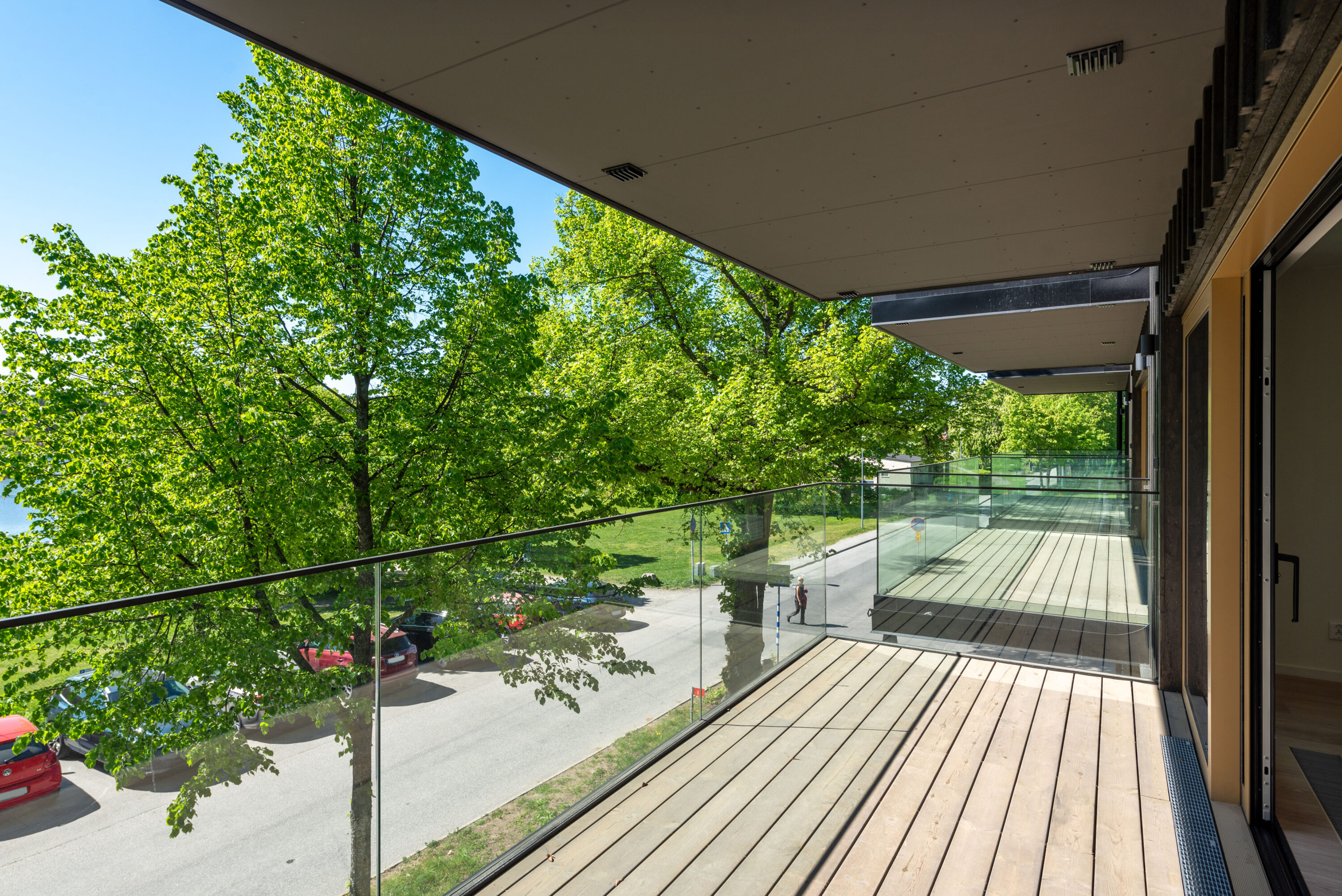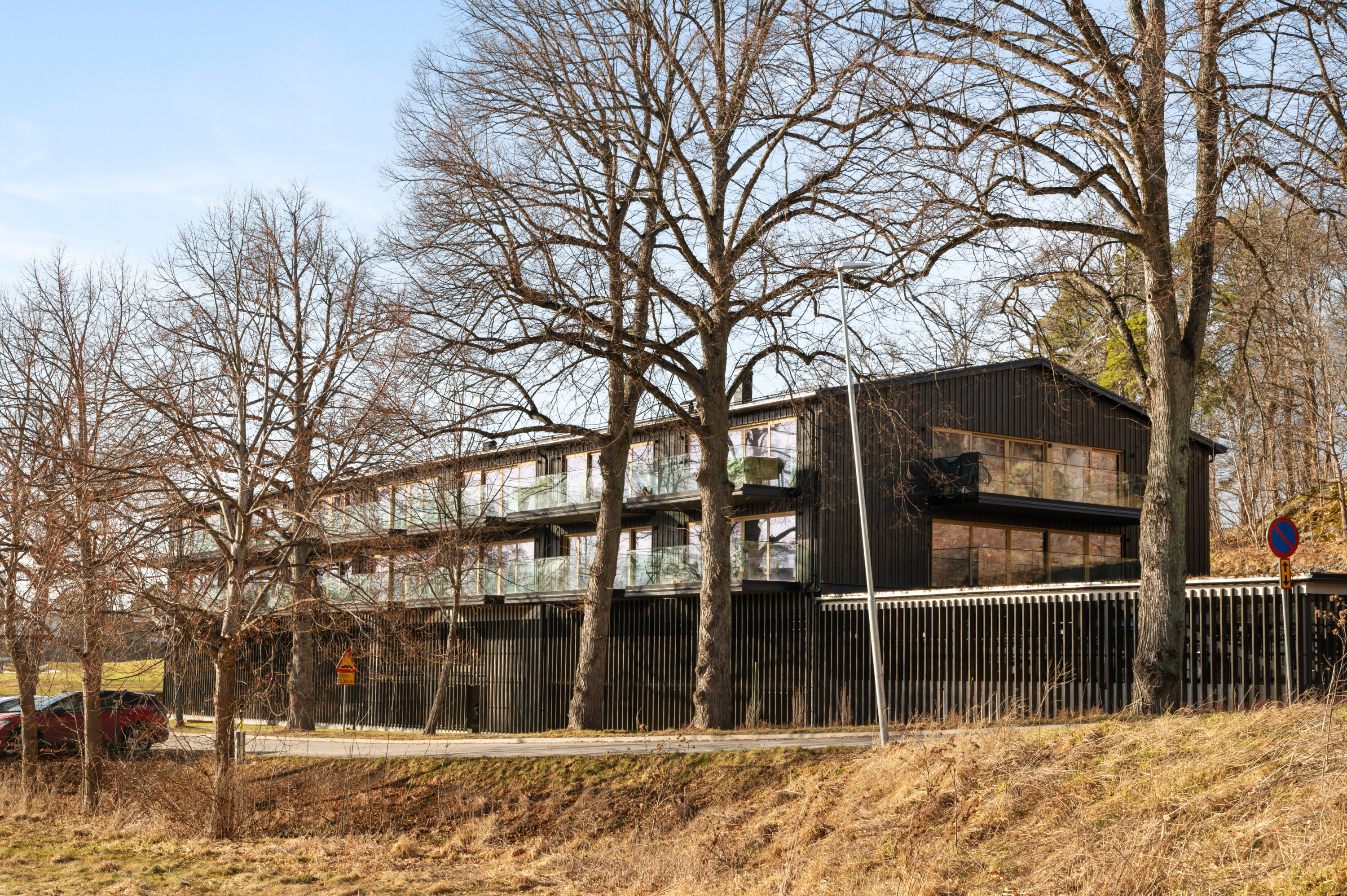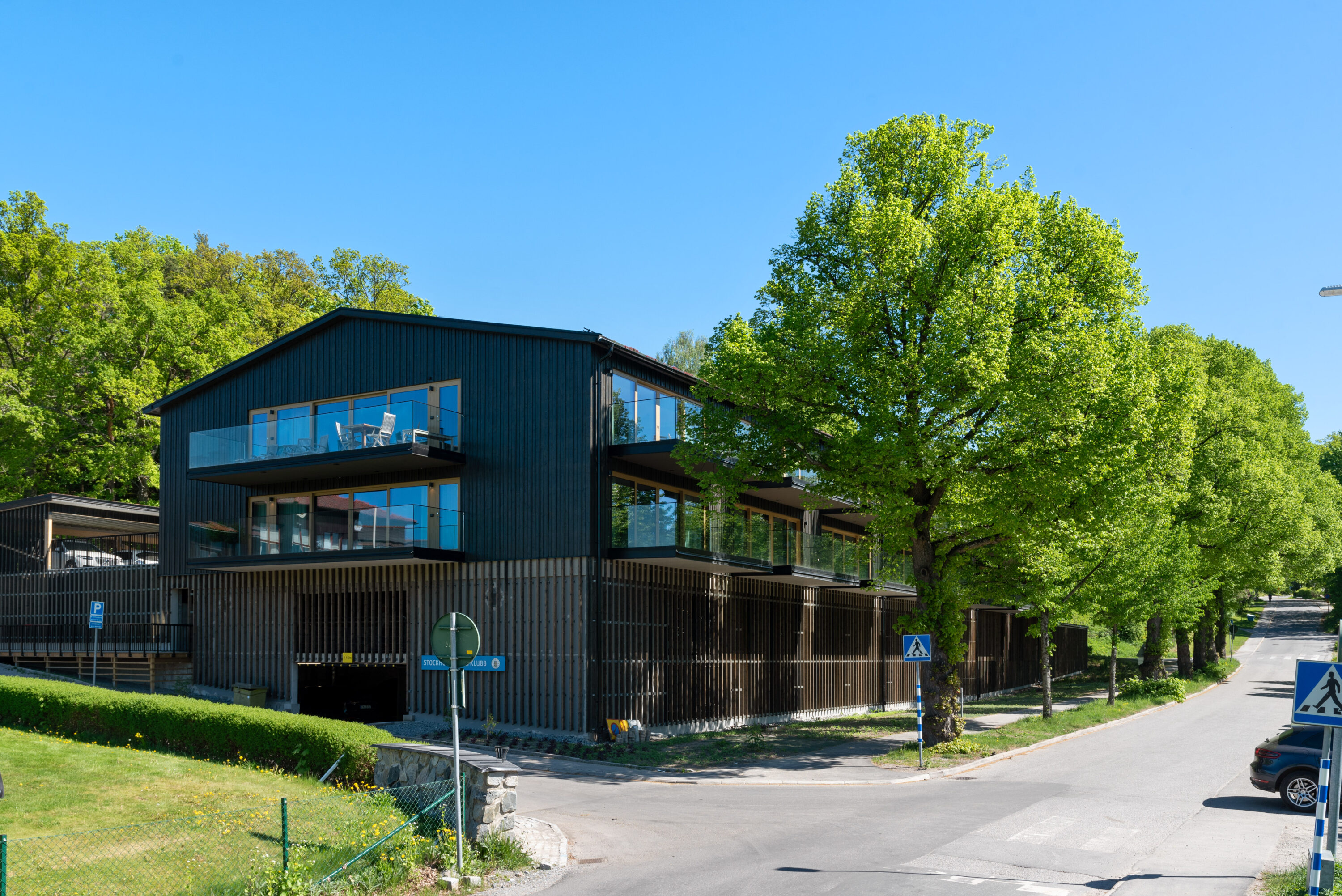 klubbhus som ligger strax bakom. Balkongerna har ett minimalistiskt formspråk med glasade