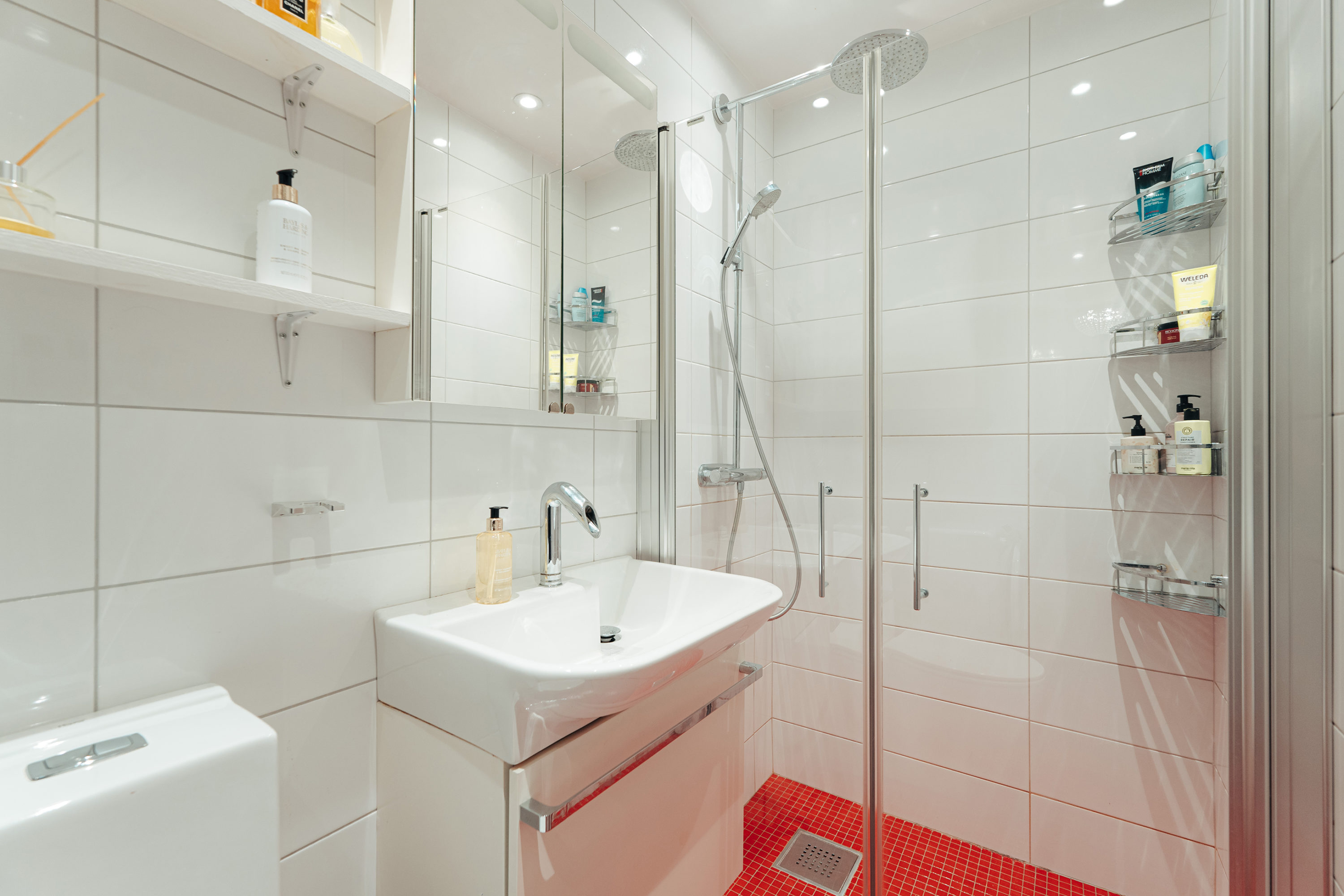 ett hemmakontor eller ett gästrum. Badrummet är modernt och fräscht med stilrena detaljer