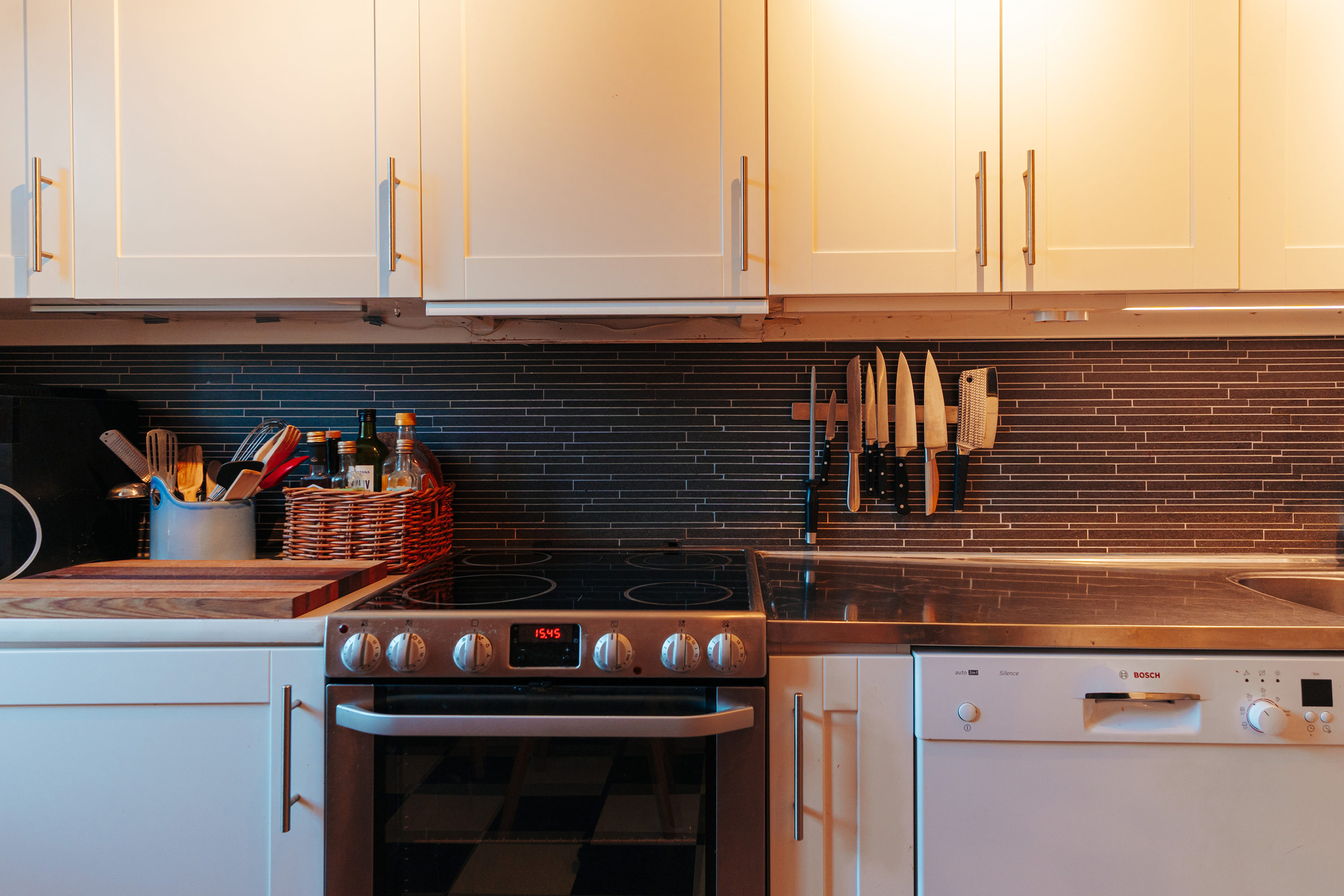 Här finns gott om förvaring och arbetsyta, vilket gör köket både praktiskt och trivsamt för