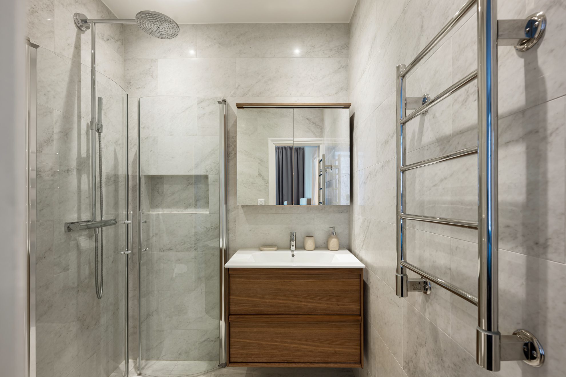 Badrummet är stilfullt renoverat med ljus marmor, glasad duschhörna, handdukstork och