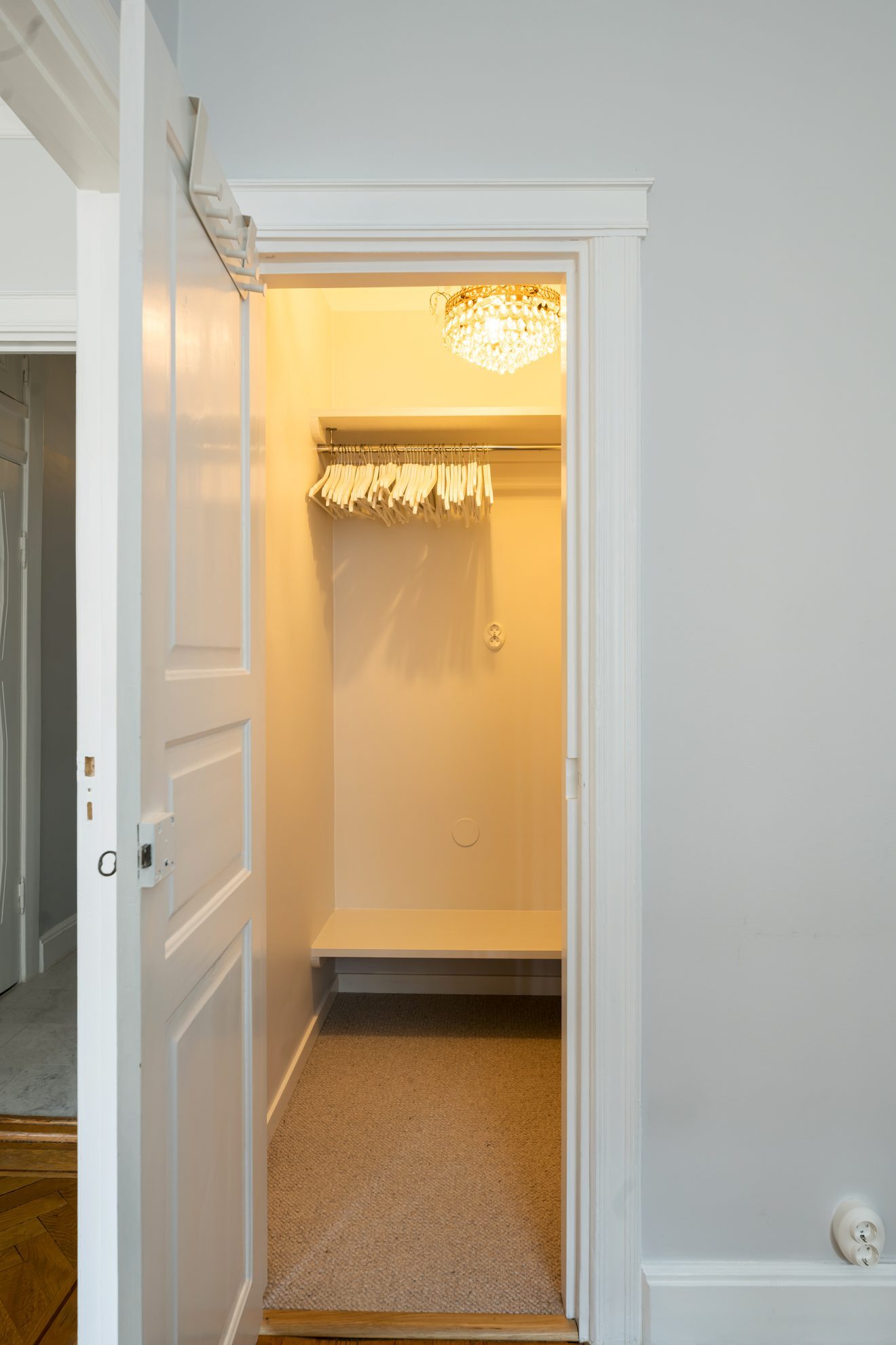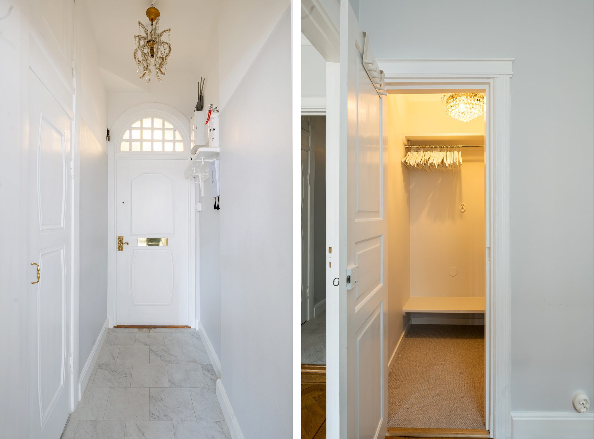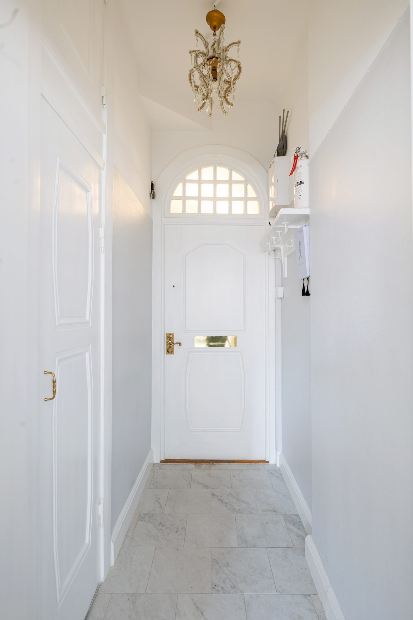 fina originaldetaljer, inklusive en dekorativ ljuskrona och vackert dörrparti.