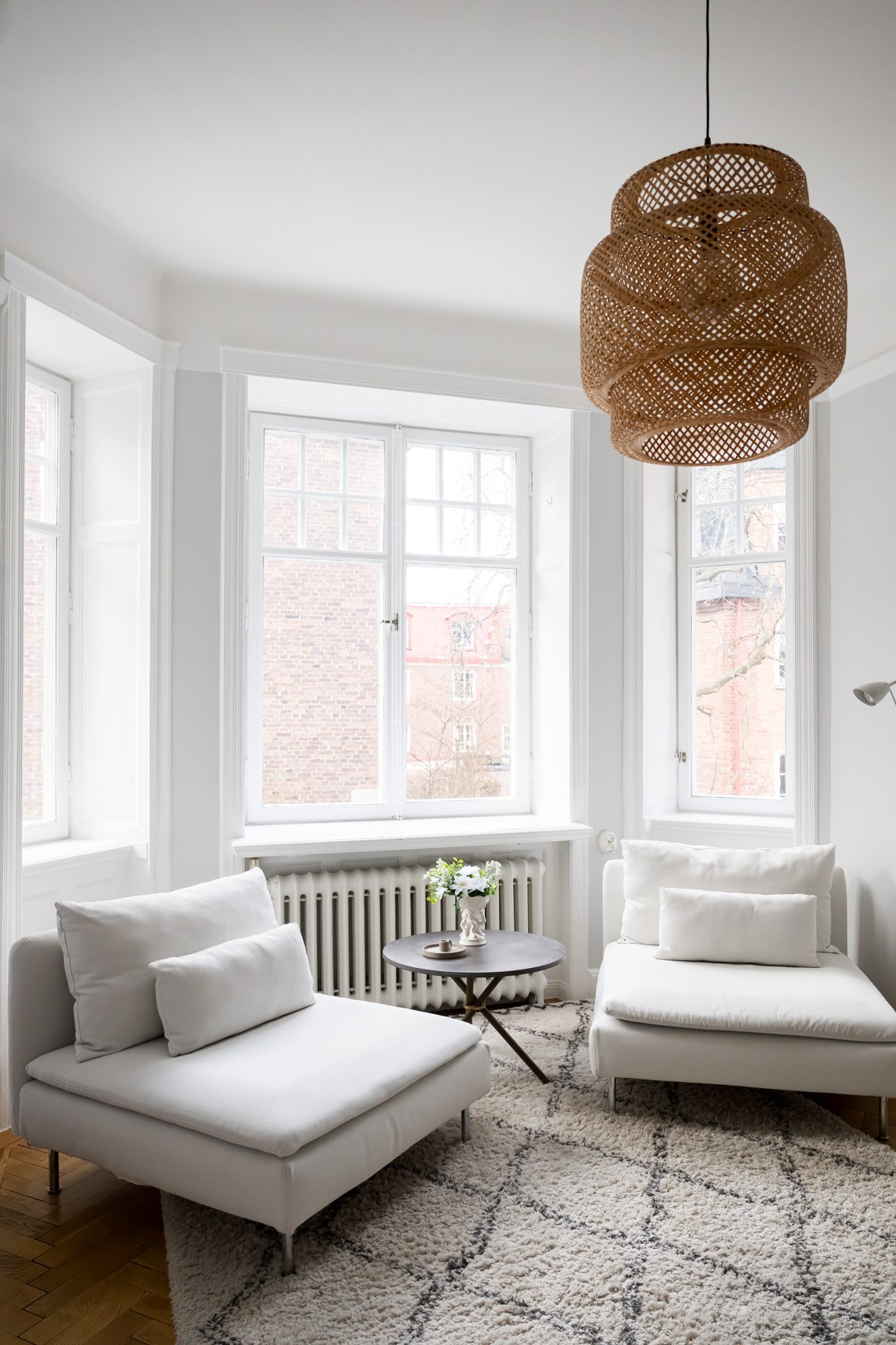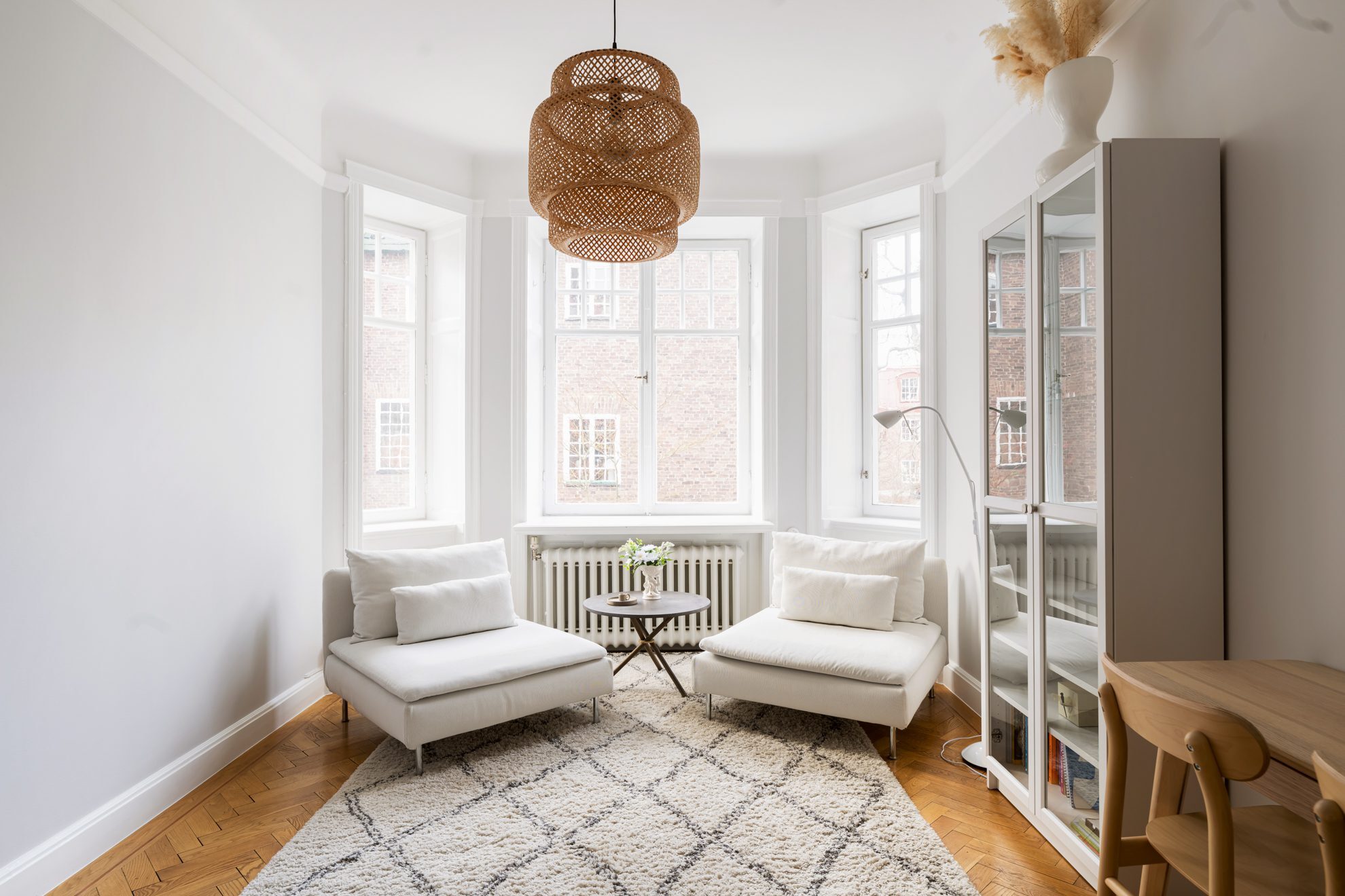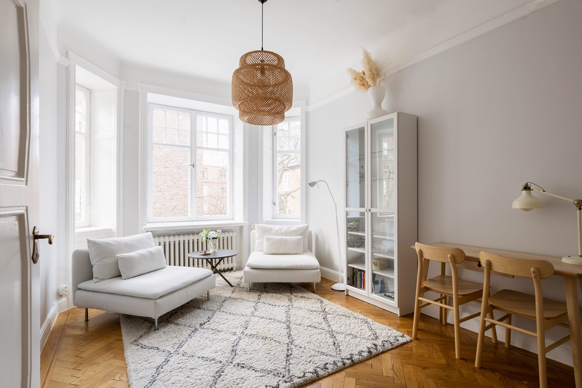Lägenheten präglas av ljus, rymd och tidstypiska detaljer kombinerat med moderna