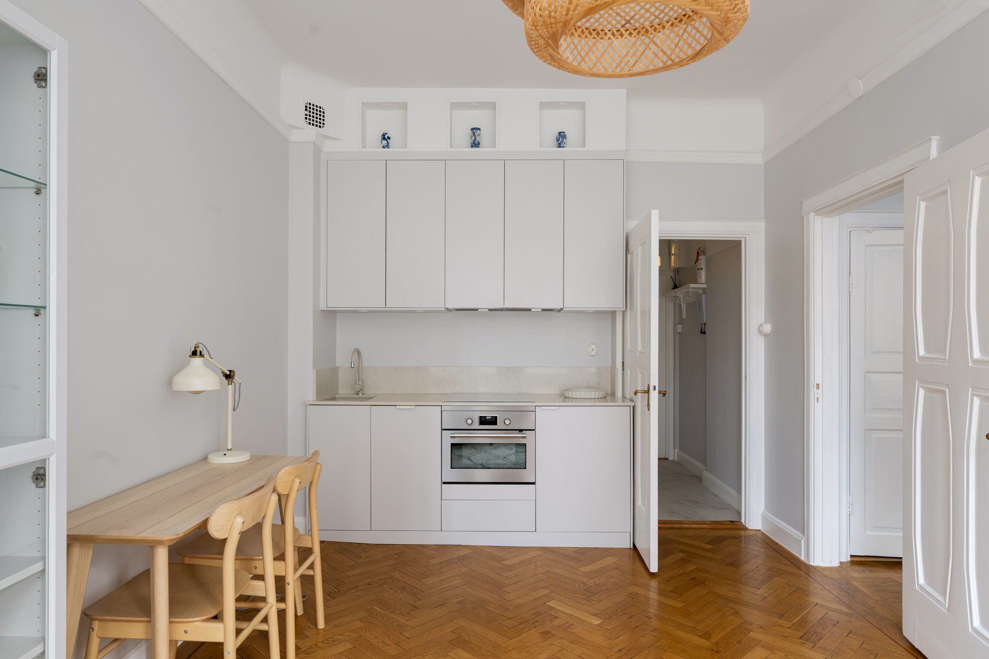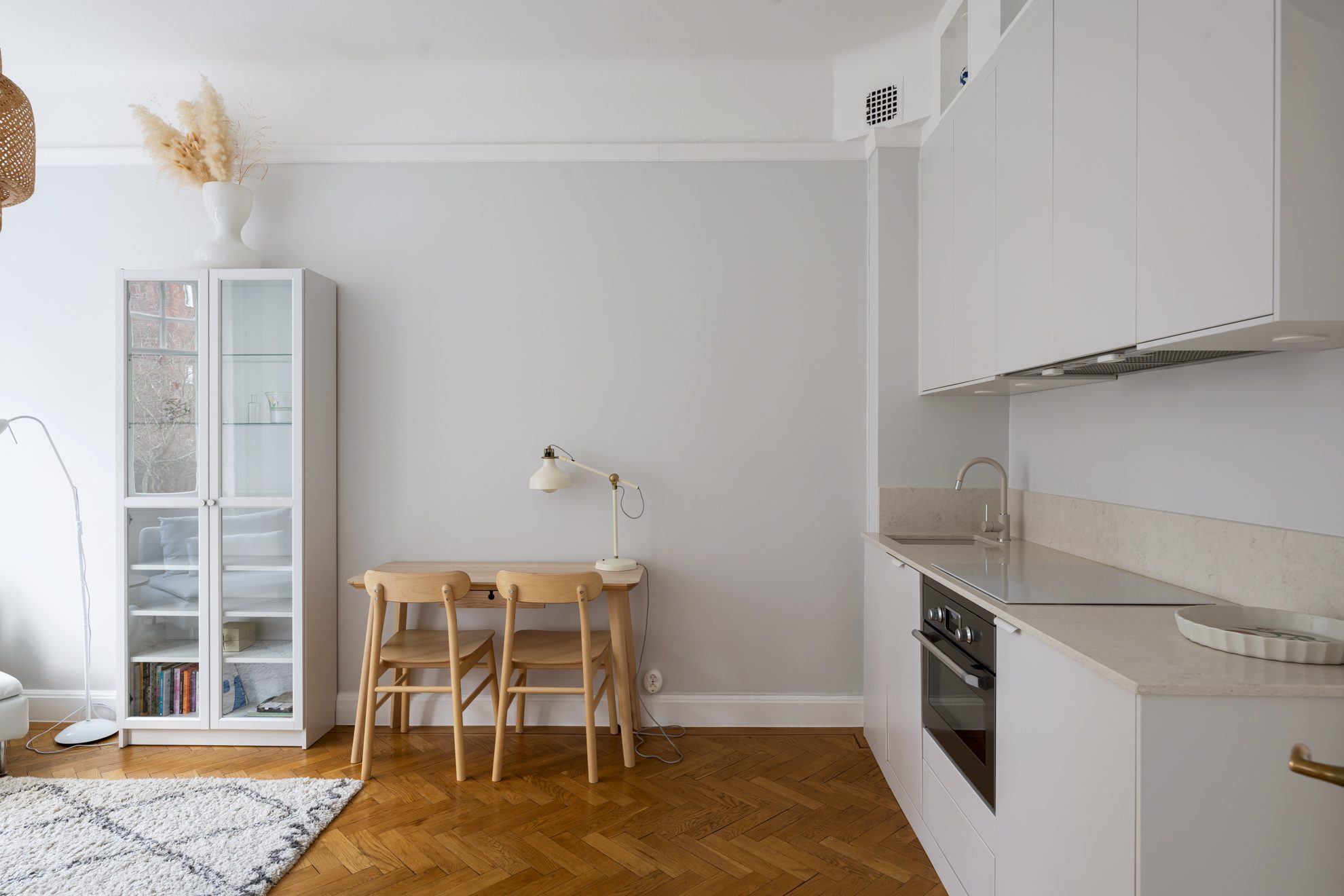 rummet binds samman av ett stilrent kök i ljusa toner, fullt utrustat med ugn, spishäll och