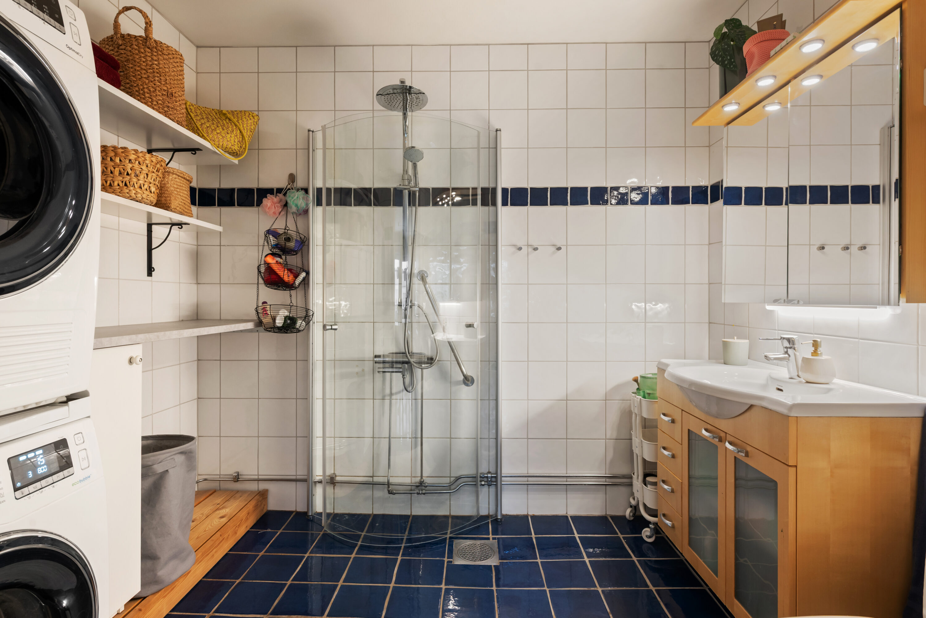 Badrummet är stort och funktionellt, utrustat med dusch, bra avlastningsytor samt tvättmaskin och torktumlare för extra bekvämlighet. Hallen erbjuder generöst med förvaring och binder samman lägenhetens rum på ett naturligt sätt.