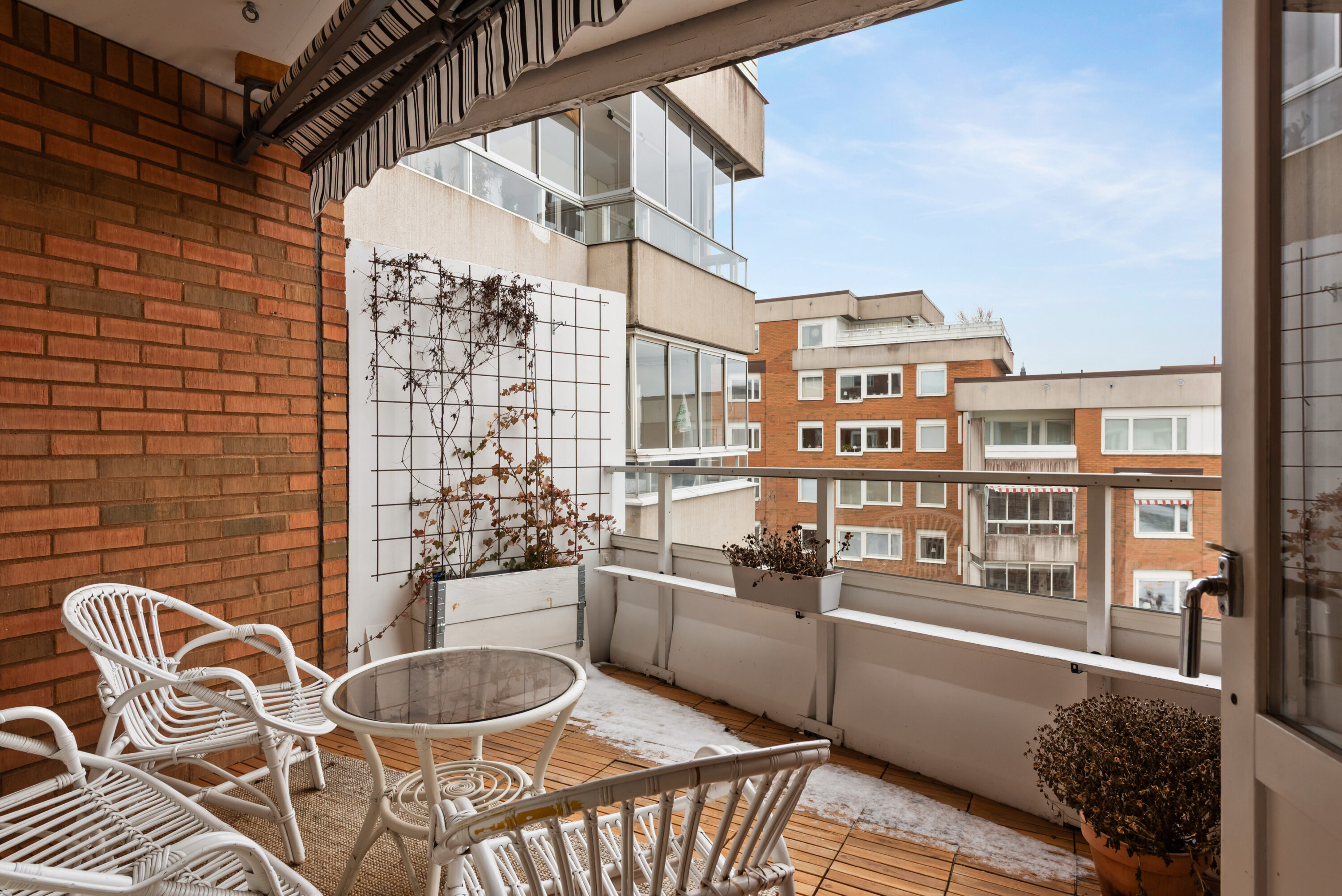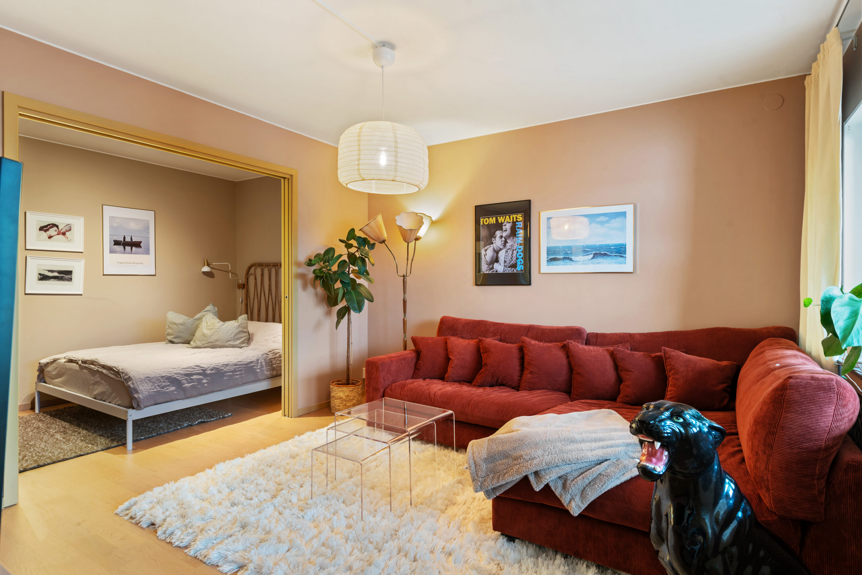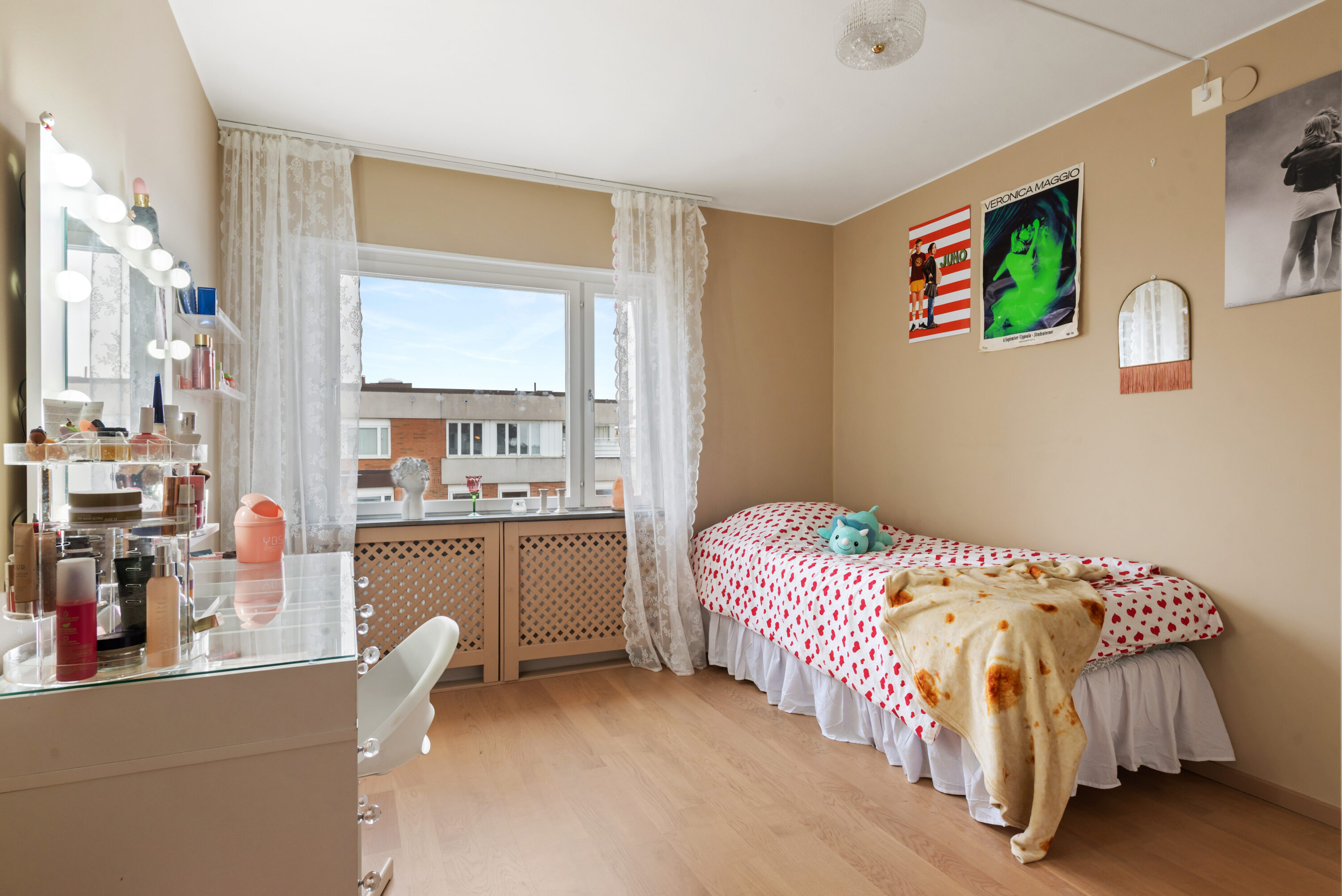 Härifrån når du även bostadens mysiga balkong, en privat uteplats med plats för sittgrupp och växter, idealisk för frukost i morgonsolen eller lugna kvällar. Sovrummen är rofyllda och ljusa, varav det ena ligger i anslutning till vardagsrummet och det andra är större och perfekt som master bedroom eller barnrum. Båda rummen har goda förvaringsmöjligheter.
