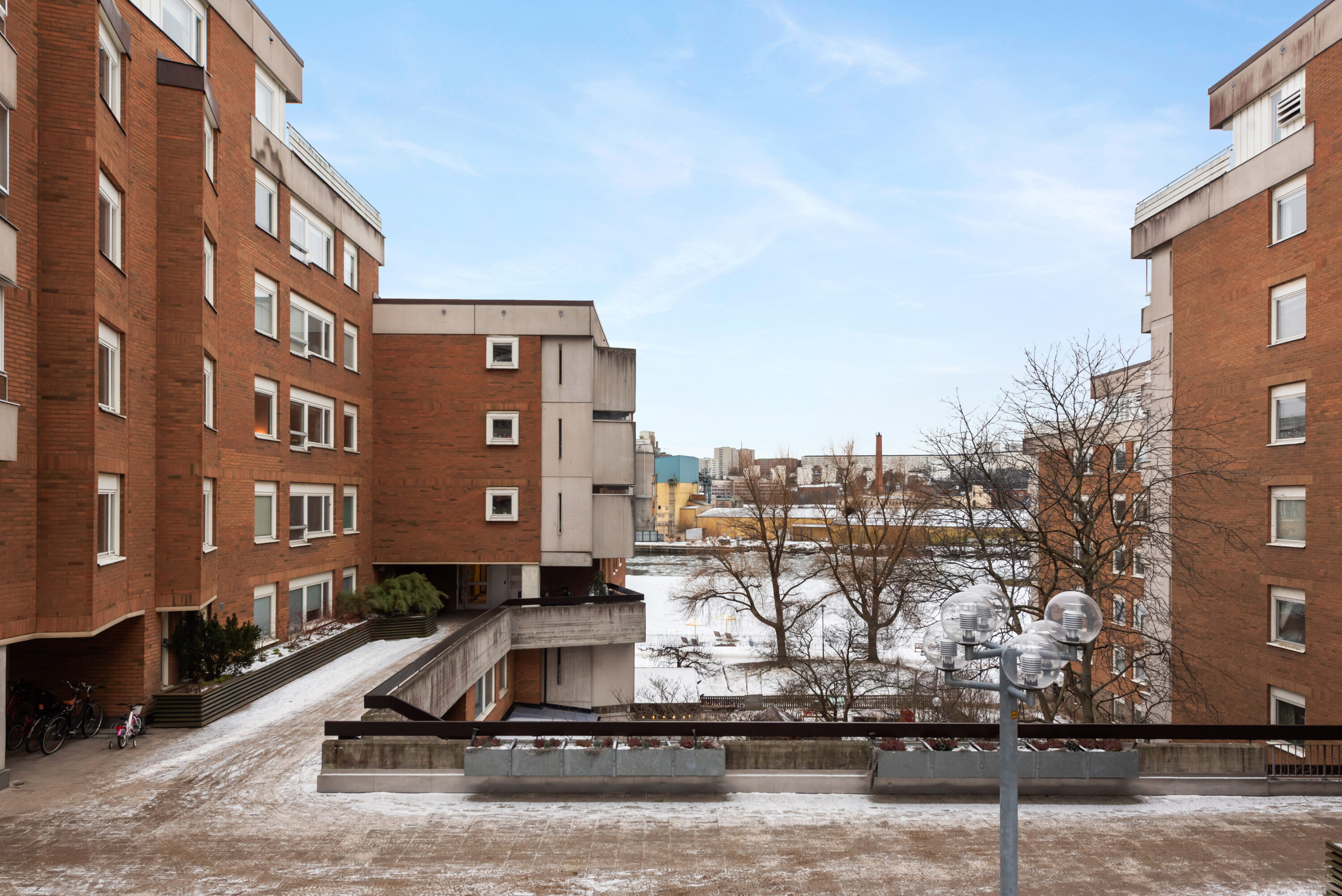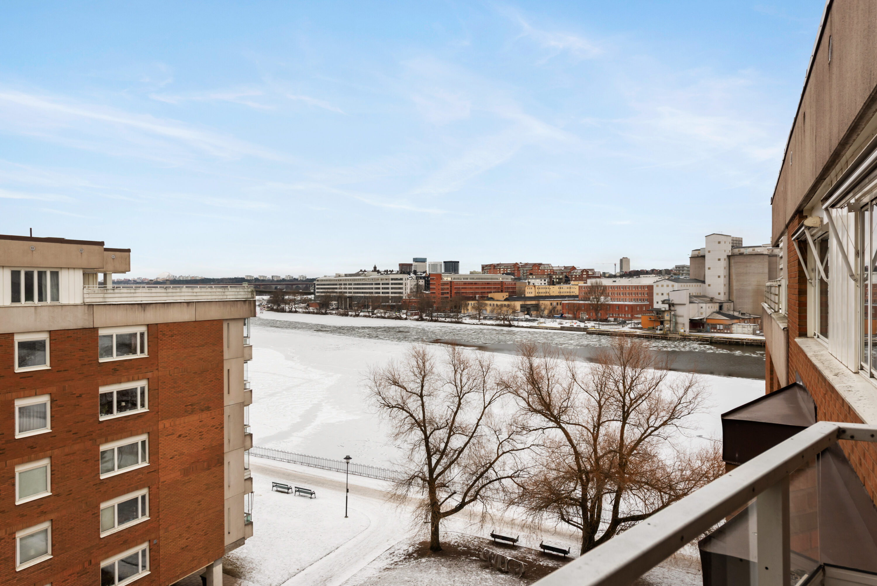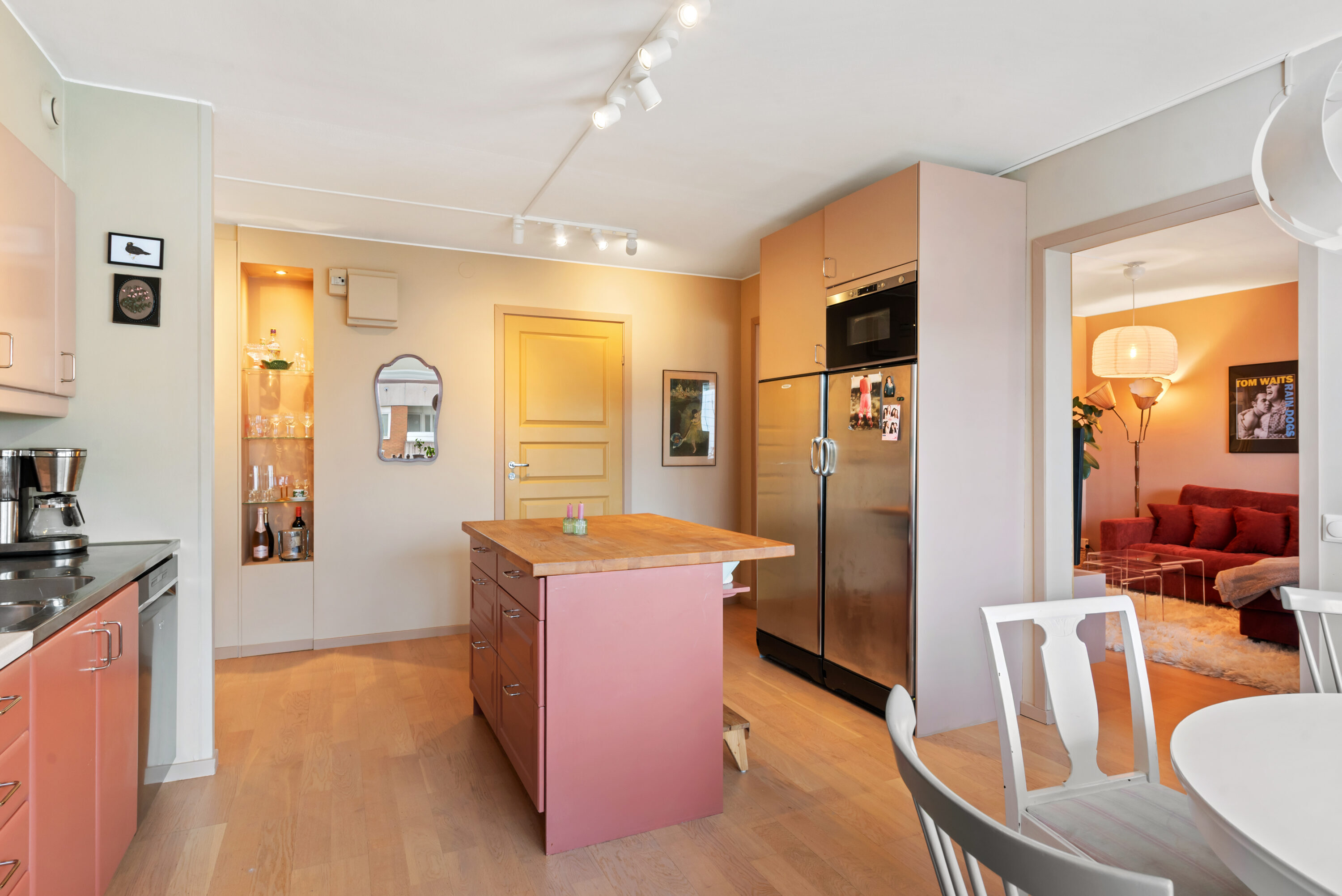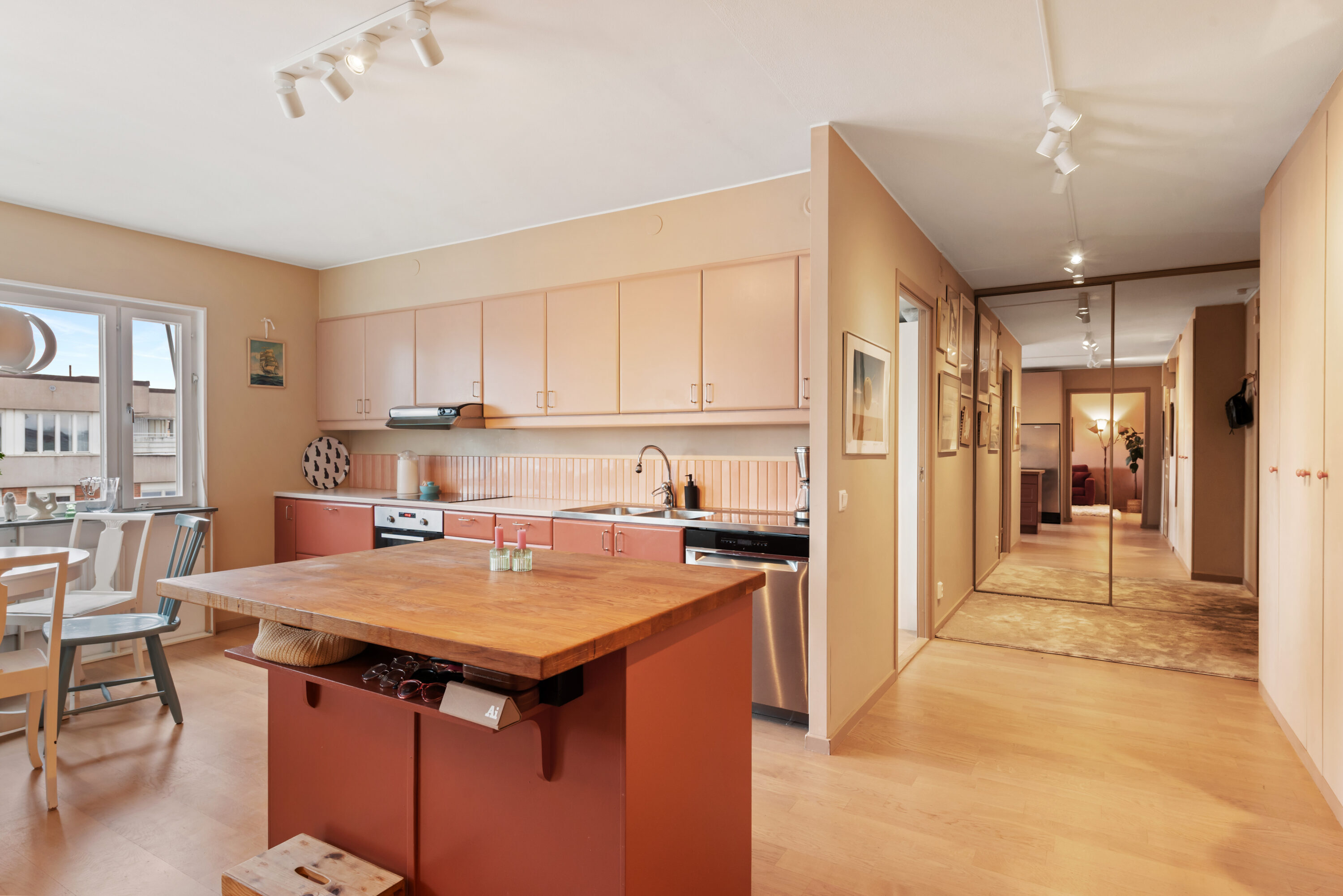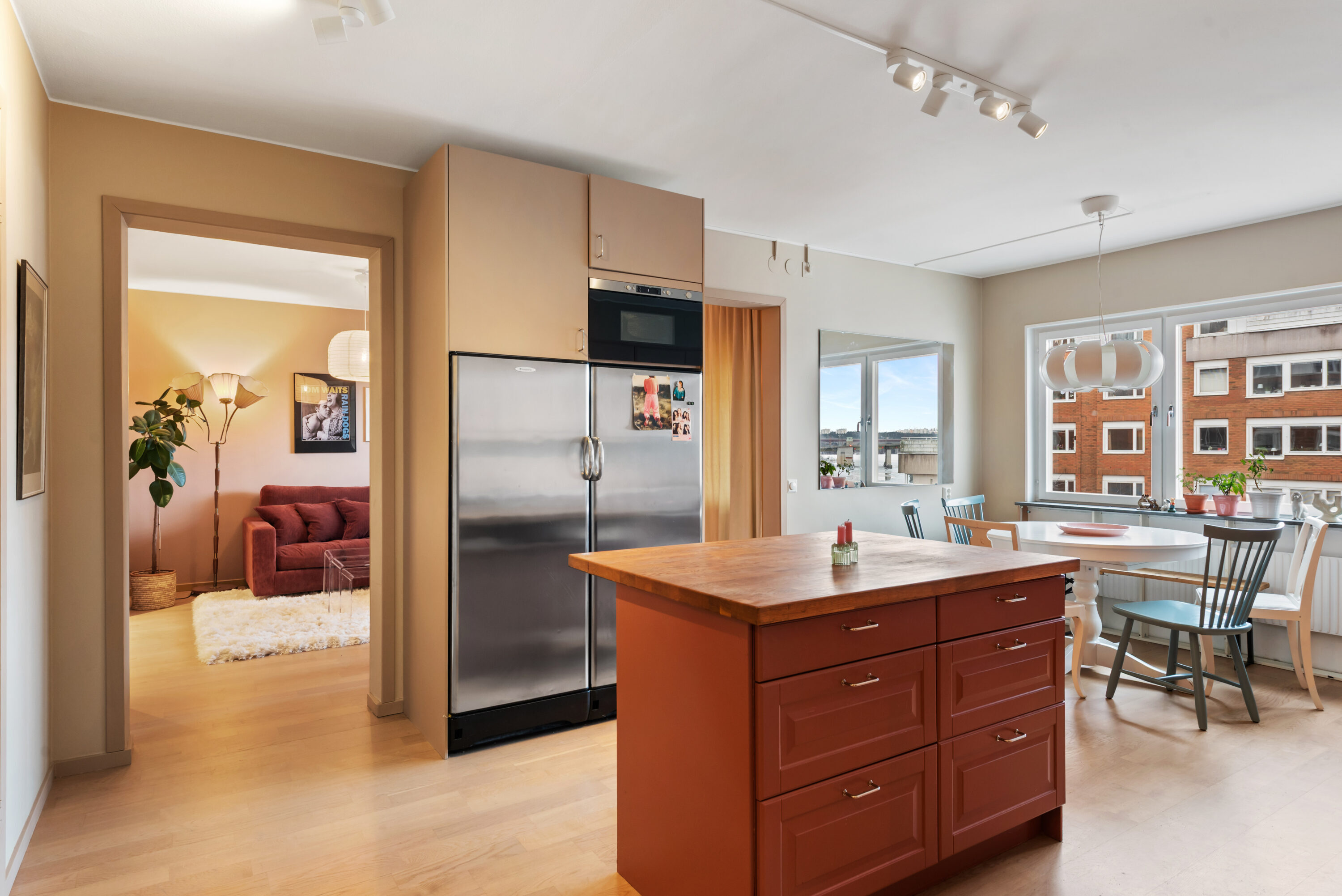 Bostaden har en rymlig och social planlösning där kök och matplats öppnar upp mot stora fönsterpartier och erbjuder härligt ljusinsläpp. Köket är fullt utrustat och har gott om arbetsytor, inklusive en köksö som fungerar perfekt för både matlagning och umgänge. Från matplatsen har du utsikt mot de karakteristiska tegelhusen och glimt av vattnet.