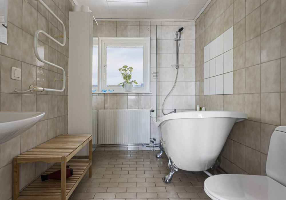 Entréplan har ett luftigt vardagsrum med utgång till balkong i västerläge, ett charmigt kök med plats för matbord och maskinell utrustning som diskmaskin och spis, samt en praktisk gäst-WC. På samma plan finns ett större sovrum med egen balkong, badrum med badkar och två handfat, samt förvaring i garderober och klädkammare.