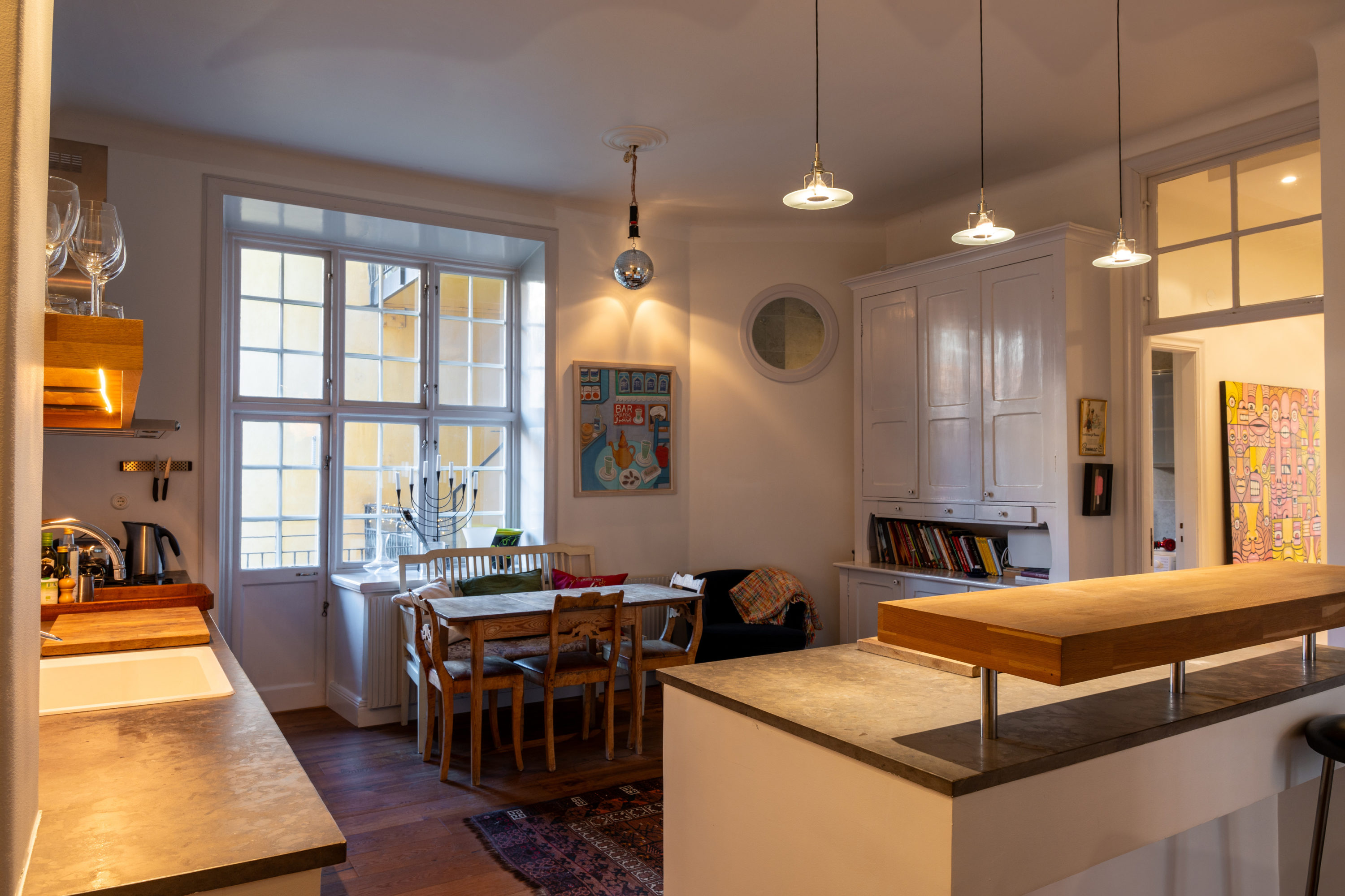 Köket är välutrustat med spis, kyl/frys och diskmaskin. Bredvid köket finns en balkong med utsikt mot gården. Dessutom finns ett master bedroom med gott om förvaringsutrymme och en 160 cm säng. Det nyrenoverade badrummet har ett badkar, golvvärme och en tvättmaskin. Det finns också ett mindre sovrum med två enkelsängar. I vardagsrummet finns en soffa, en smart TV och en arbetsplats. Matsalen inkluderar ett matbord och en flygel. I entrén finns en liten toalett.
